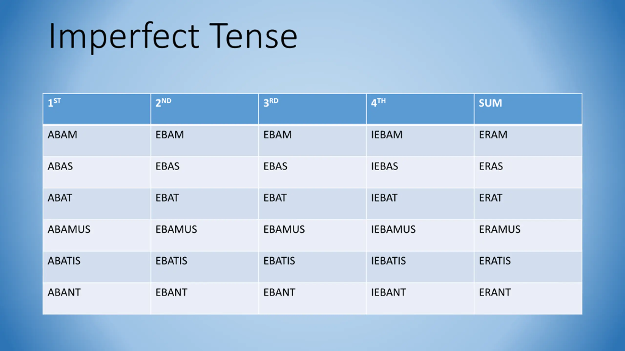 Imperfect Tense 1ST 2ND 3RD 4TH SUM ABAM EBAM EBAM IEBAM ERAM ABAS EBAS EBAS IEBAS ERAS ABAT EBAT EBAT IEBAT ERAT ABAMUS EBAMUS EBAMUS IEBAMUS ERAMUS ABATIS EBATIS EBATIS IEBATIS ERATIS ABANT EBANT EBANT IEBANT ERANT