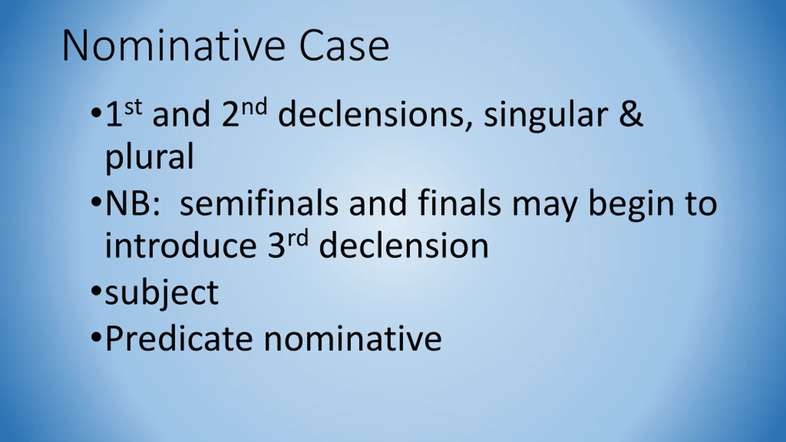 Nominative Case 1stand 2nddeclensions, singular & plural NB: semifinals and finals may begin to introduce 3rddeclension subject Predicate nominative