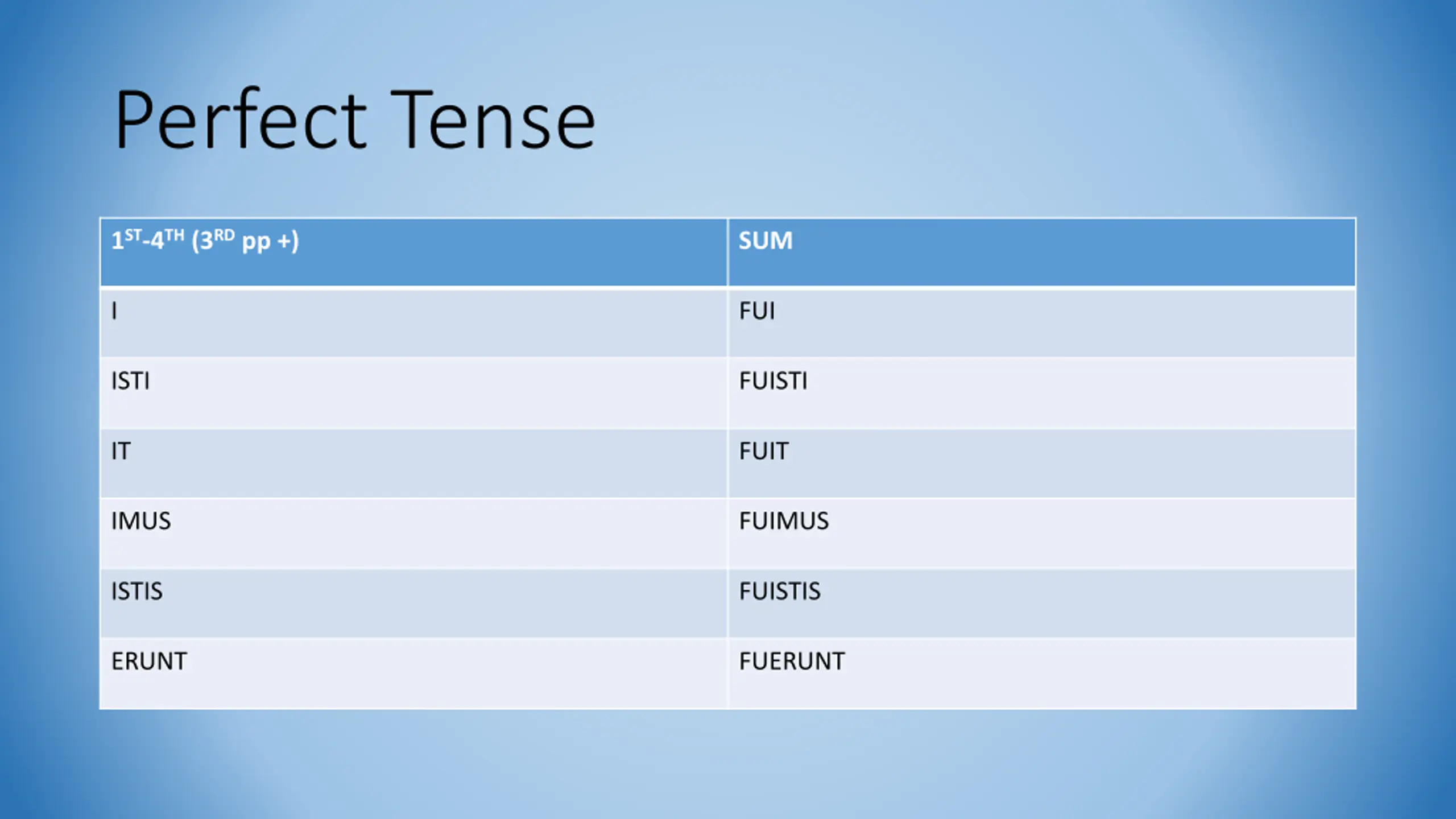 Perfect Tense 1ST-4TH(3RDpp +) SUM I FUI ISTI FUISTI IT FUIT IMUS FUIMUS ISTIS FUISTIS ERUNT FUERUNT