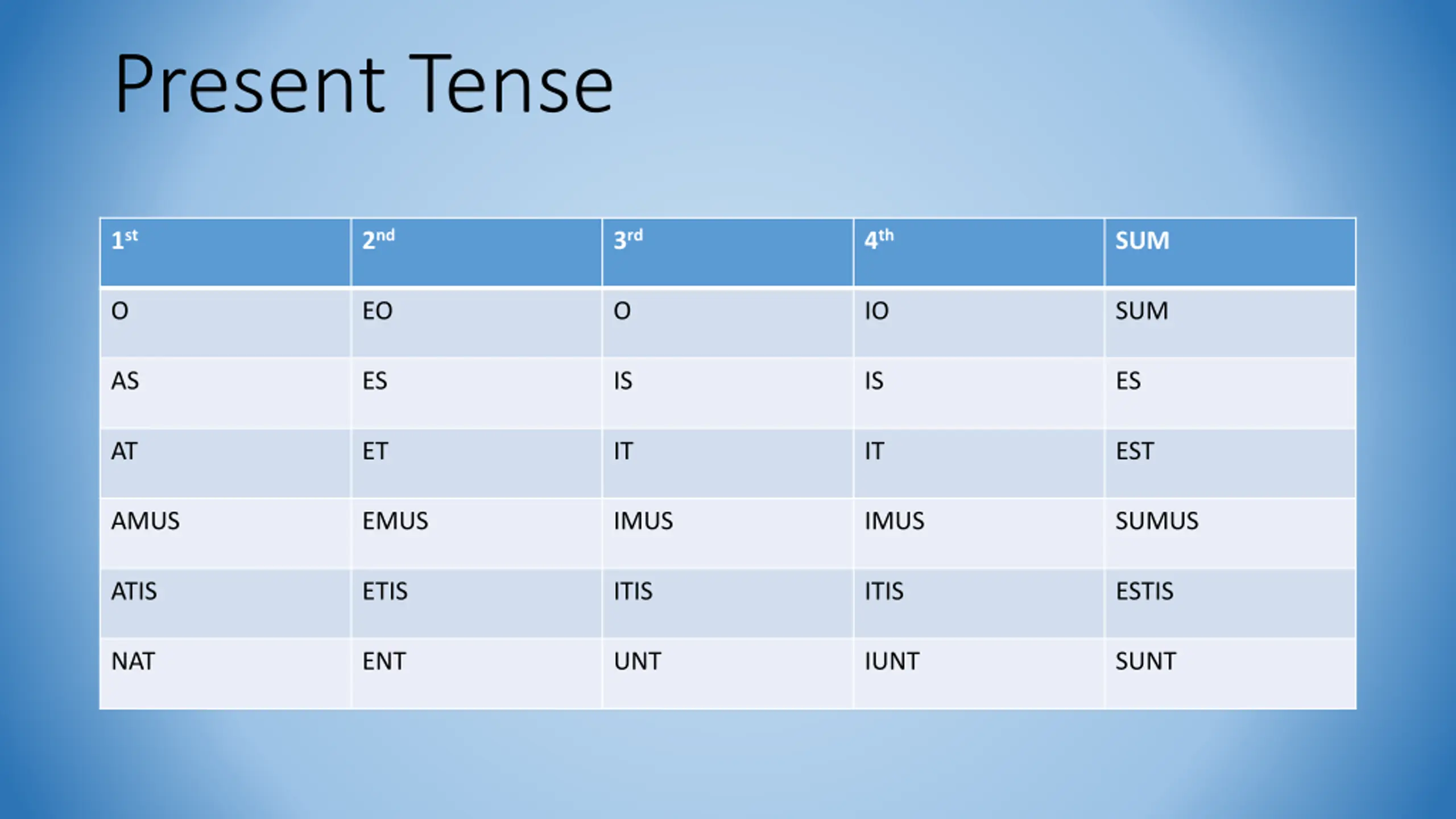 Present Tense 1st 2nd 3rd 4th SUM O EO O IO SUM AS ES IS IS ES AT ET IT IT EST AMUS EMUS IMUS IMUS SUMUS ATIS ETIS ITIS ITIS ESTIS NAT ENT UNT IUNT SUNT