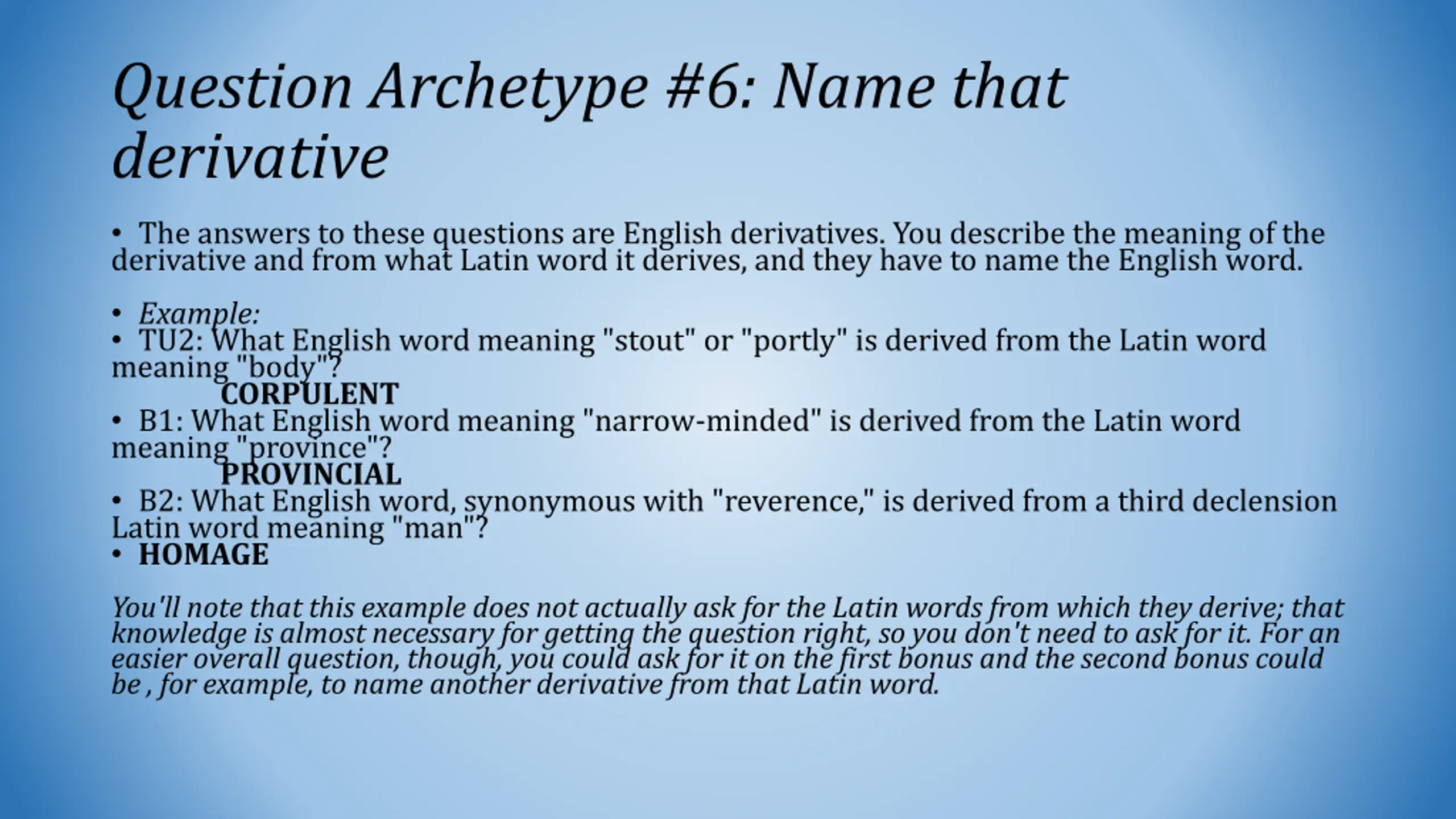 Question Archetype #6: Name that derivative The answers to these questions are English derivatives. You describe the meaning of the derivative and from what Latin word it derives, and they have to name the English word. Example: TU2: What English word meaning "stout" or "portly" is derived from the Latin word meaning "body"? CORPULENT B1: What English word meaning "narrow-minded" is derived from the Latin word meaning "province"? PROVINCIAL B2: What English word, synonymous with "reverence," is derived from a third declension Latin word meaning "man"? HOMAGE You'll note that this example does not actually ask for the Latin words from which they derive; that knowledge is almost necessary for getting the question right, so you don't need to ask for it. For an easier overall question, though, you could ask for it on the first bonus and the second bonus could be , for example, to name another derivative from that Latin word.