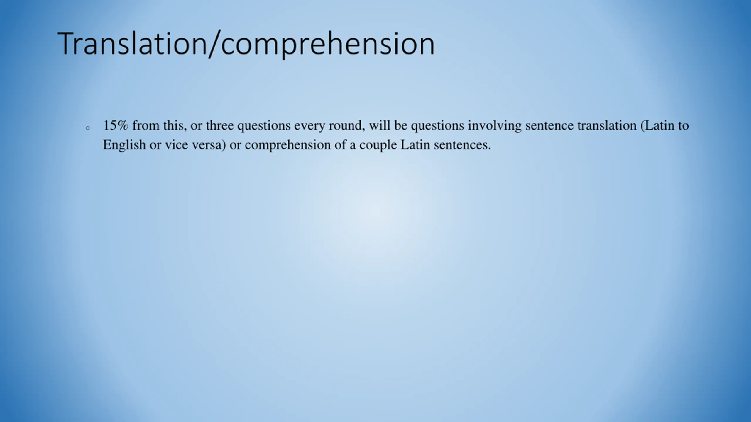 Translation/comprehension 15% from this, or three questions every round, will be questions involving sentence translation (Latin to English or vice versa) or comprehension of a couple Latin sentences. o