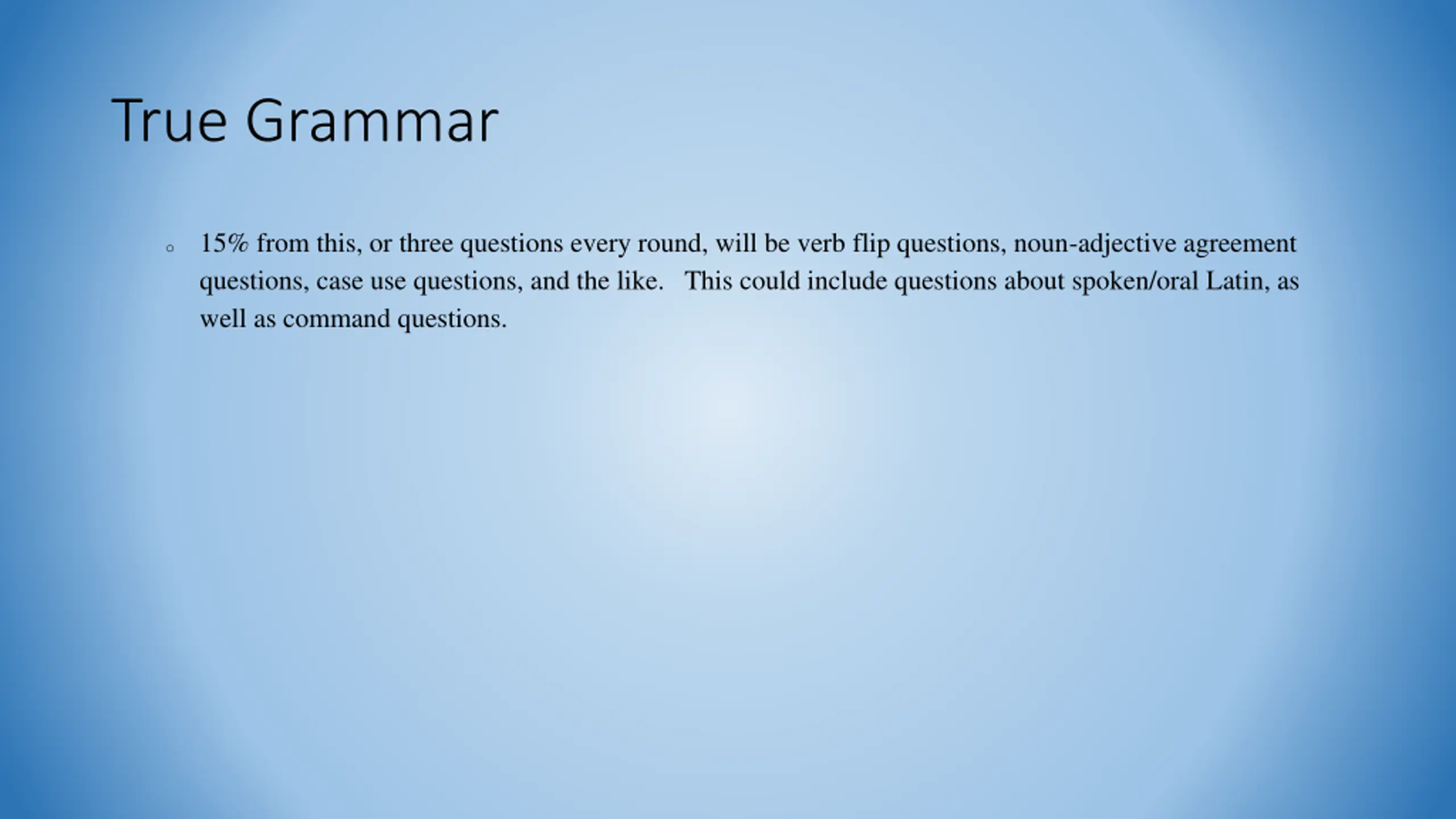 True Grammar 15% from this, or three questions every round, will be verb flip questions, noun-adjective agreement questions, case use questions, and the like. This could include questions about spoken/oral Latin, as well as command questions. o