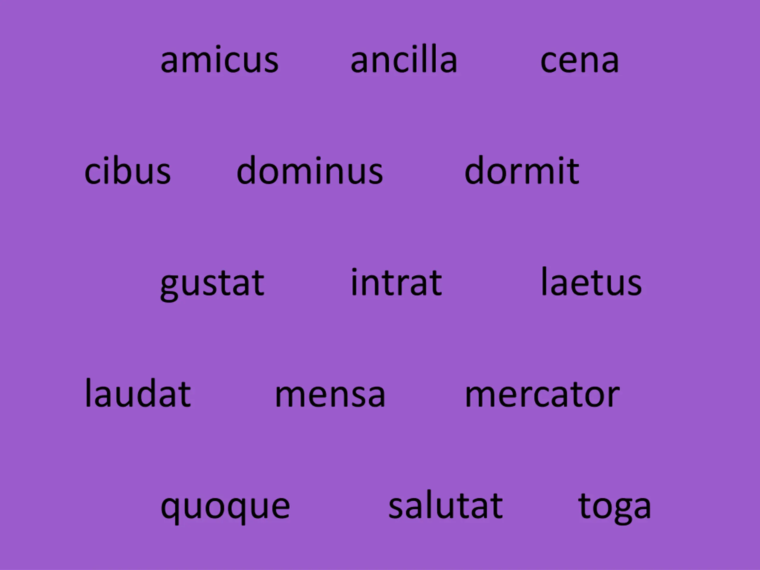 amicus ancilla cena cibus dominus dormit gustat intrat laetus laudat mensa mercator quoque salutat toga