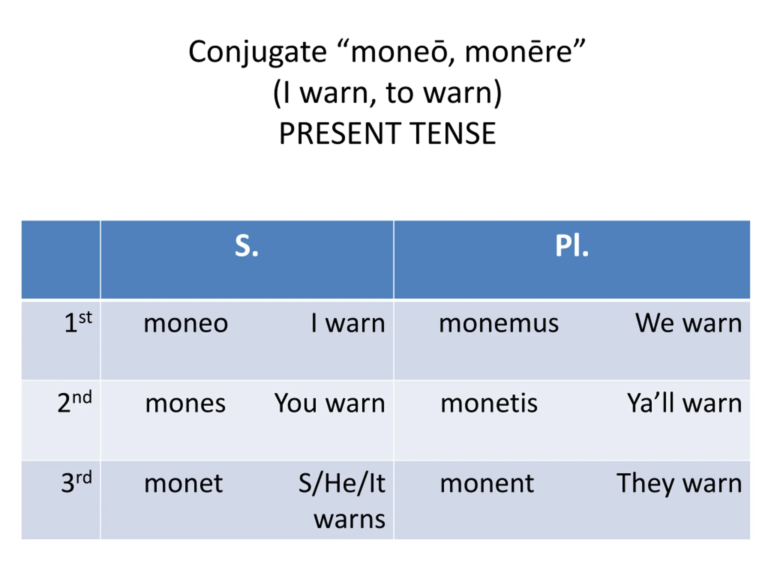 Conjugate mone, monre (I warn, to warn) PRESENT TENSE S. Pl. 1st moneo I warn monemus We warn 2nd mones You warn monetis Ya ll warn 3rd monet S/He/It monent They warn warns