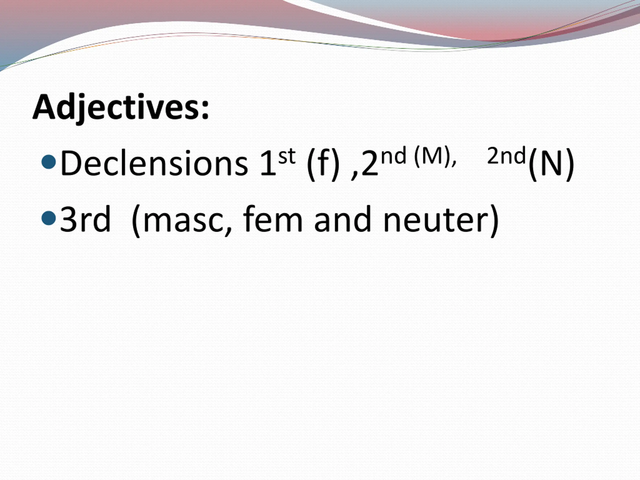 Adjectives: Declensions 1st(f) ,2nd (M), 3rd (masc, fem and neuter) 2nd(N)