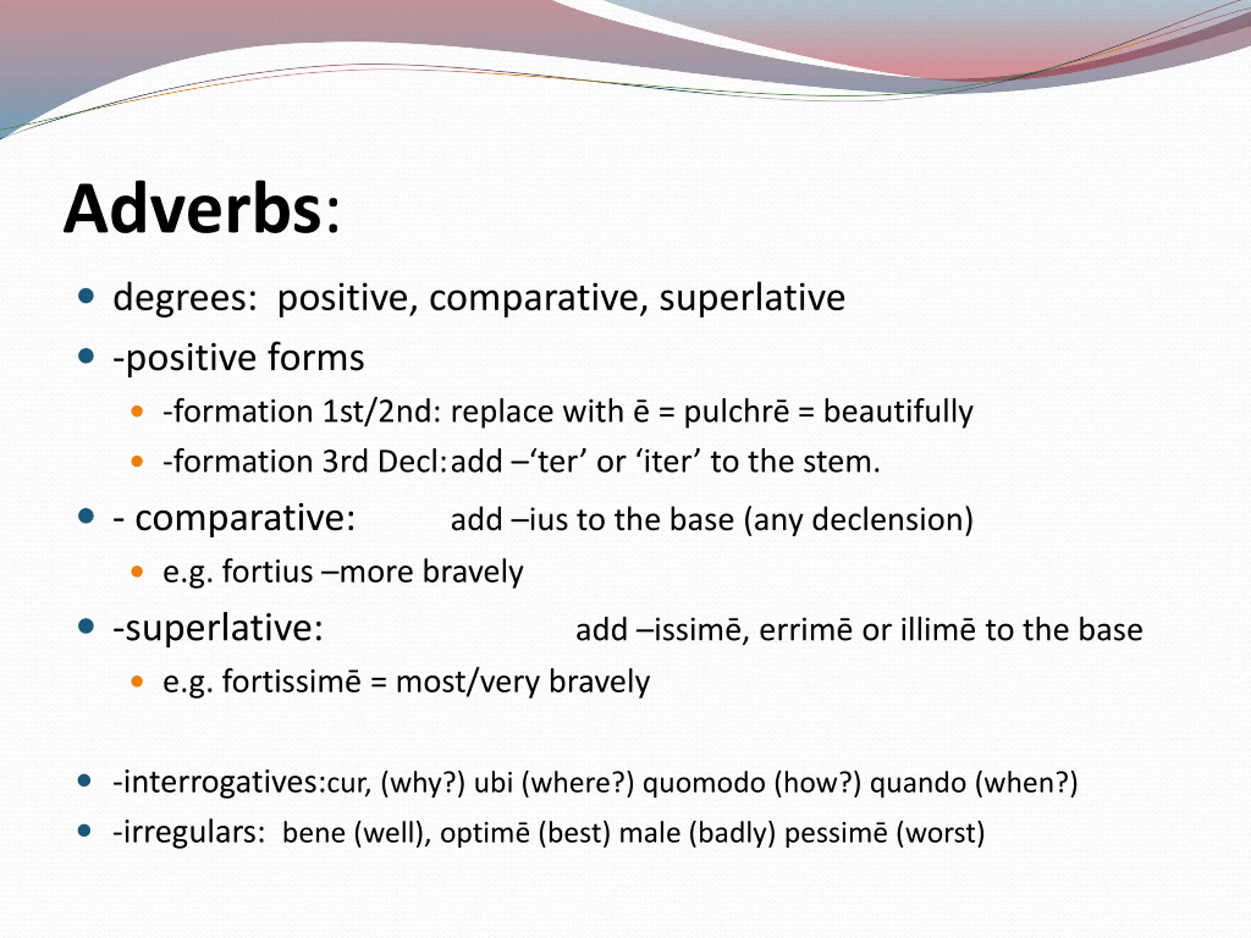 Adverbs: degrees: positive, comparative, superlative -positive forms -formation 1st/2nd: replace with = pulchr = beautifully -formation 3rd Decl:add ter or iter to the stem. - comparative: add ius to the base (any declension) e.g. fortius more bravely -superlative: add issim , errim or illim to the base e.g. fortissim = most/very bravely -interrogatives:cur, (why?) ubi (where?) quomodo (how?) quando (when?) -irregulars: bene (well), optim (best) male (badly) pessim (worst)