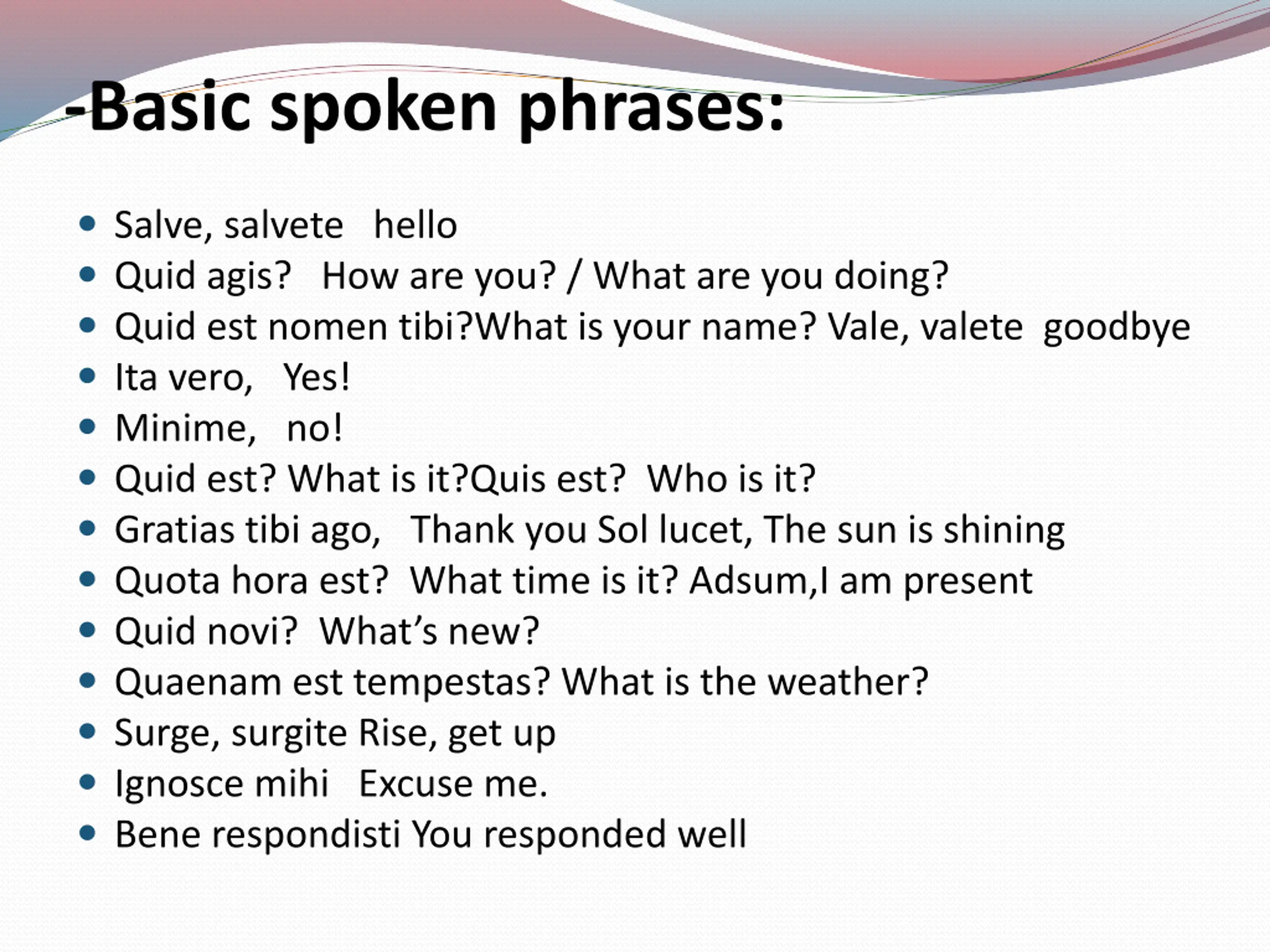 -Basic spoken phrases: Salve, salvete hello Quid agis? How are you? / What are you doing? Quid est nomen tibi?What is your name? Vale, valete goodbye Ita vero, Yes! Minime, no! Quid est? What is it?Quis est? Who is it? Gratias tibi ago, Thank you Sol lucet, The sun is shining Quota hora est? What time is it? Adsum,I am present Quid novi? What s new? Quaenam est tempestas? What is the weather? Surge, surgite Rise, get up Ignosce mihi Excuse me. Bene respondisti You responded well