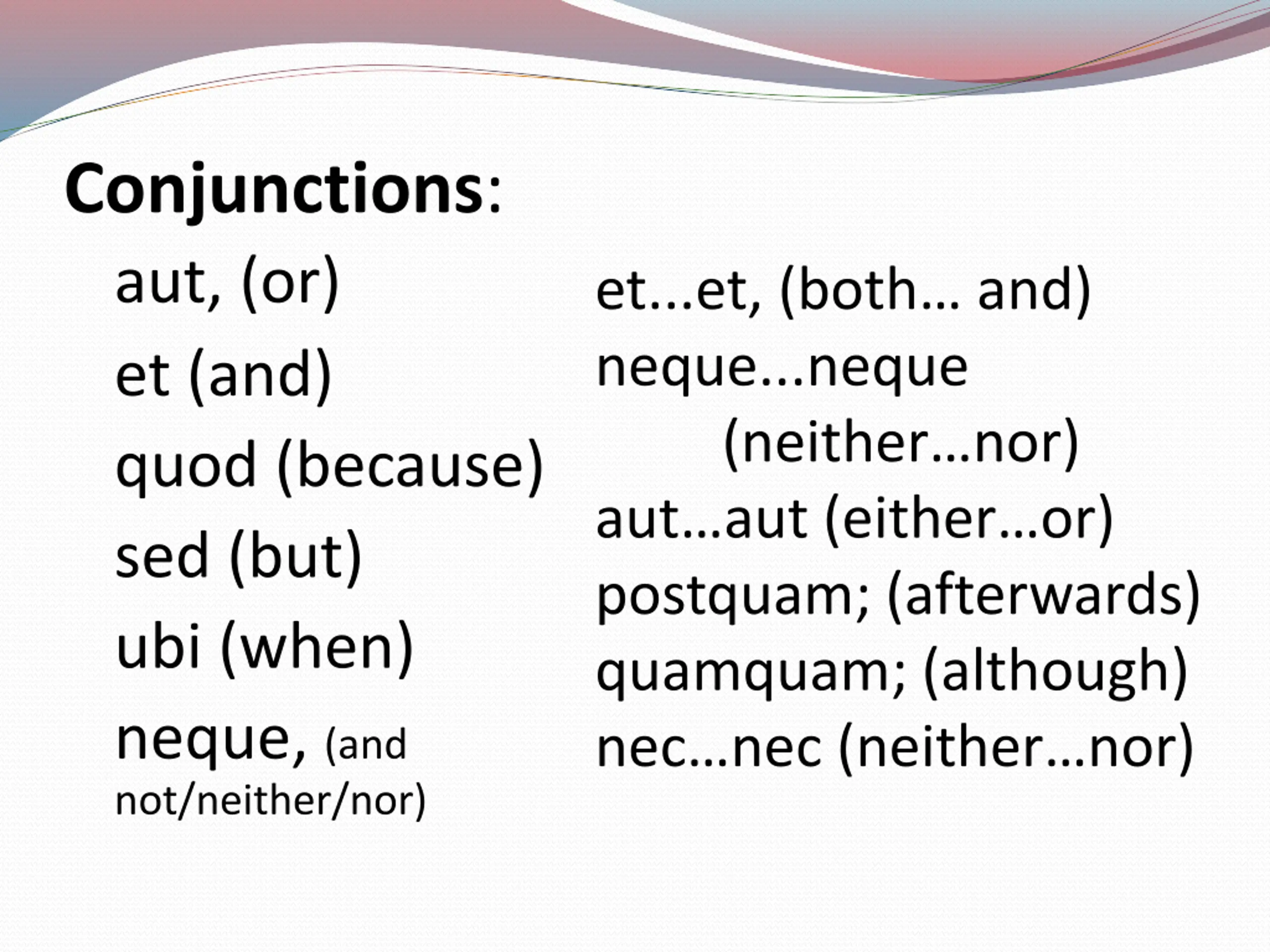 Conjunctions: aut, (or) et (and) quod (because) sed (but) ubi (when) neque, (and not/neither/nor) et...et, (both and) neque...neque (neither nor) aut aut (either or) postquam; (afterwards) quamquam; (although) nec nec (neither nor)