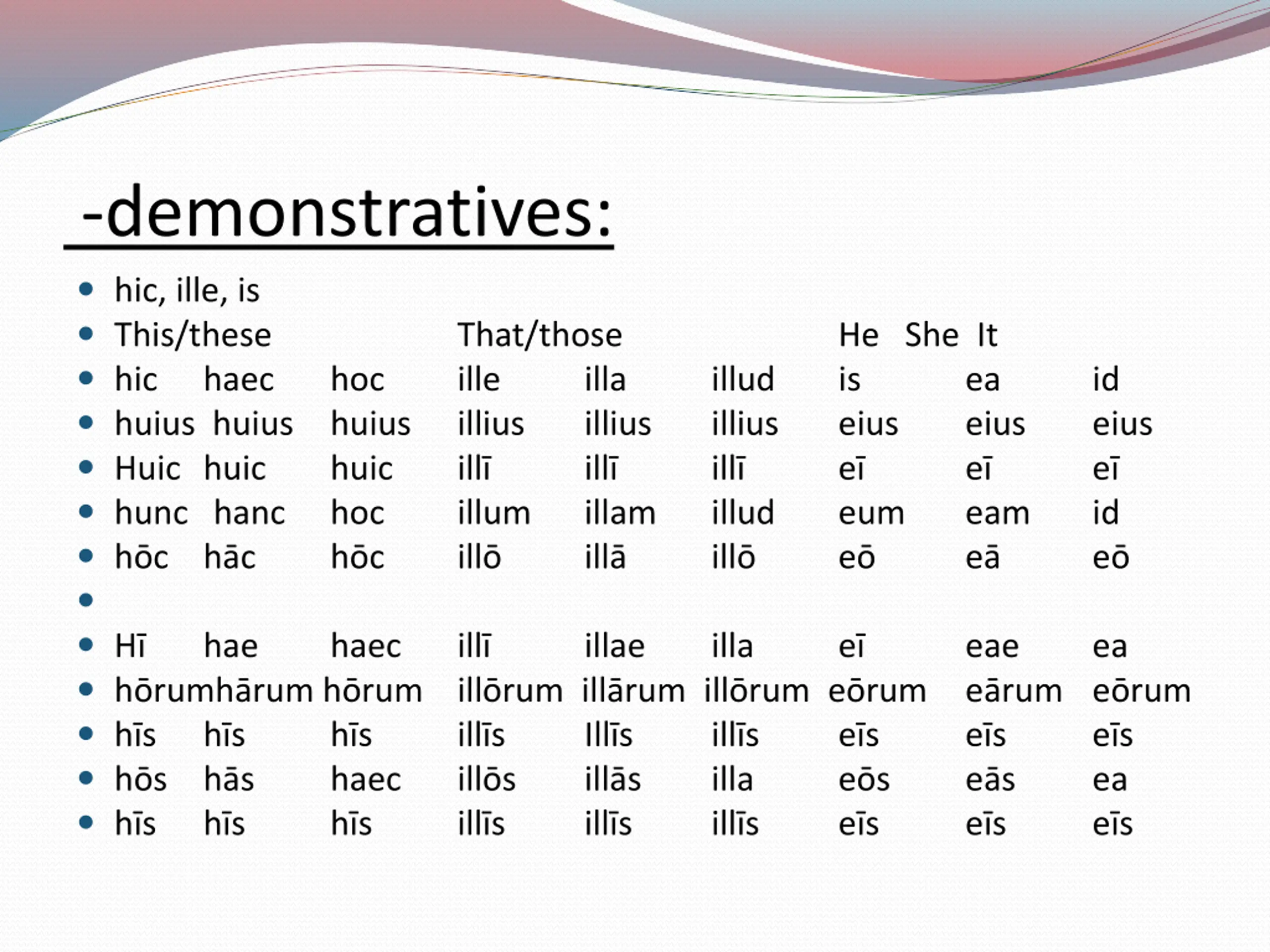 -demonstratives: hic, ille, is This/these hic haec hoc huius huius huius Huic huic huic hunc hanc hoc h c h c h c H hae haec h rumh rum h rum h s h s h s h s h s haec h s h s h s That/those ille illius ill illum ill He She It is eius e eum e illa illius ill illam ill illud illius ill illud ill ea eius e eam e id eius e id e ill ill rum ill rum ill rum e rum ill s Ill s ill s ill s ill s ill s illae illa e eae e rum e rum e s e s e s ea ill s illa ill s e s e s e s e s ea e s