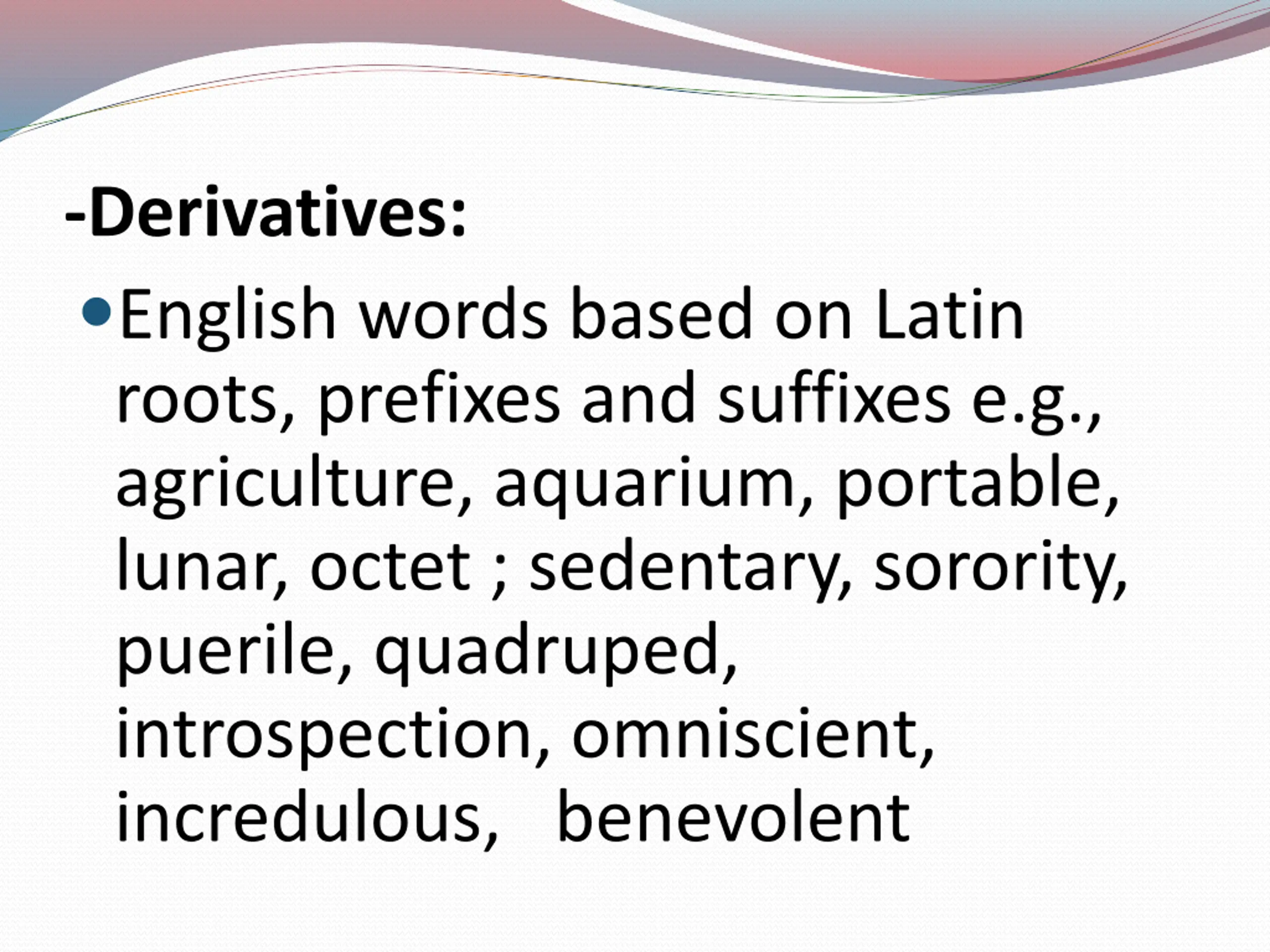 -Derivatives: English words based on Latin roots, prefixes and suffixes e.g., agriculture, aquarium, portable, lunar, octet ; sedentary, sorority, puerile, quadruped, introspection, omniscient, incredulous, benevolent