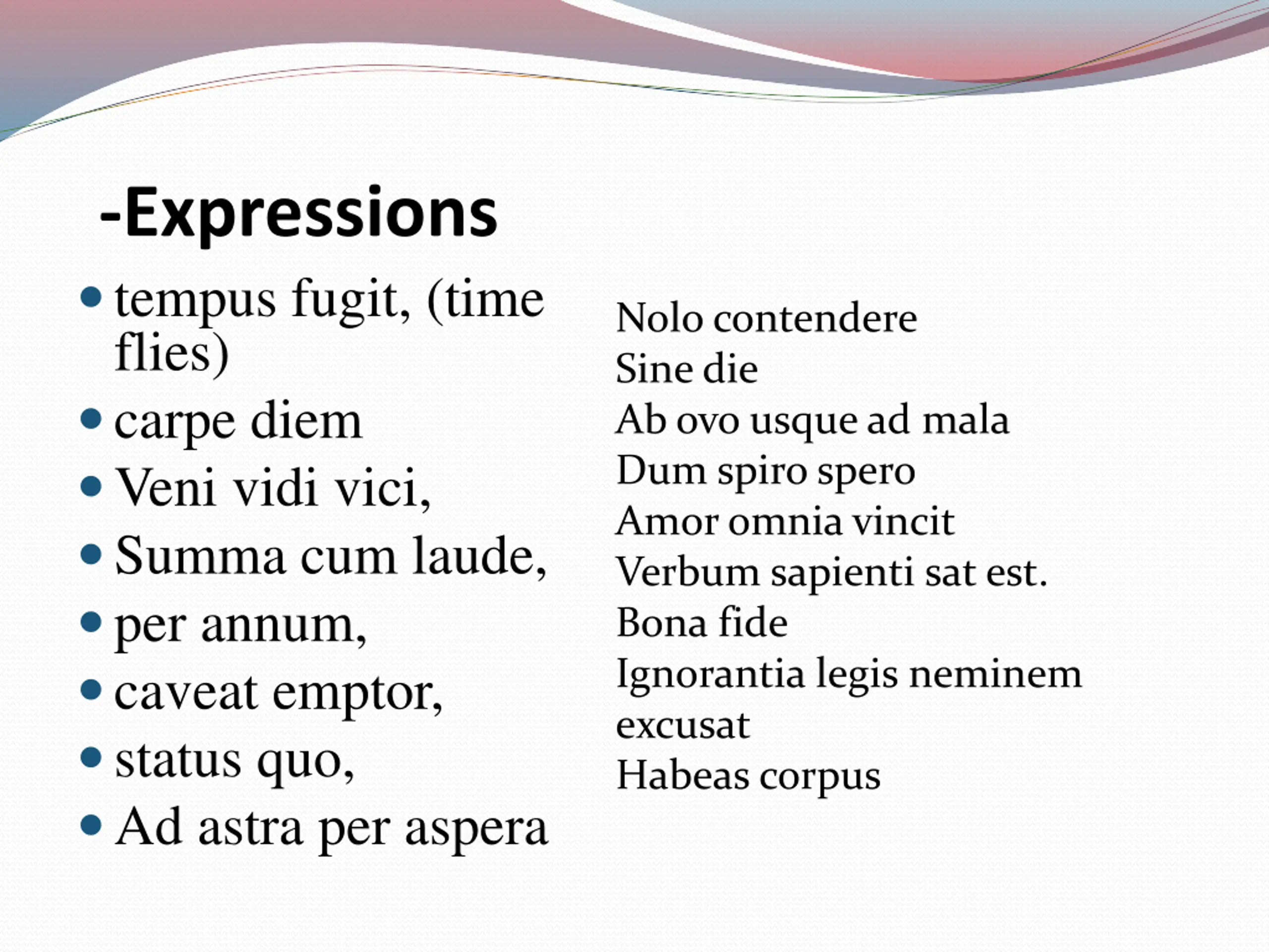 -Expressions tempus fugit, (time flies) carpe diem Veni vidi vici, Summa cum laude, per annum, caveat emptor, status quo, Ad astra per aspera Nolo contendere Sine die Ab ovo usque ad mala Dum spiro spero Amor omnia vincit Verbum sapienti sat est. Bona fide Ignorantia legis neminem excusat Habeas corpus