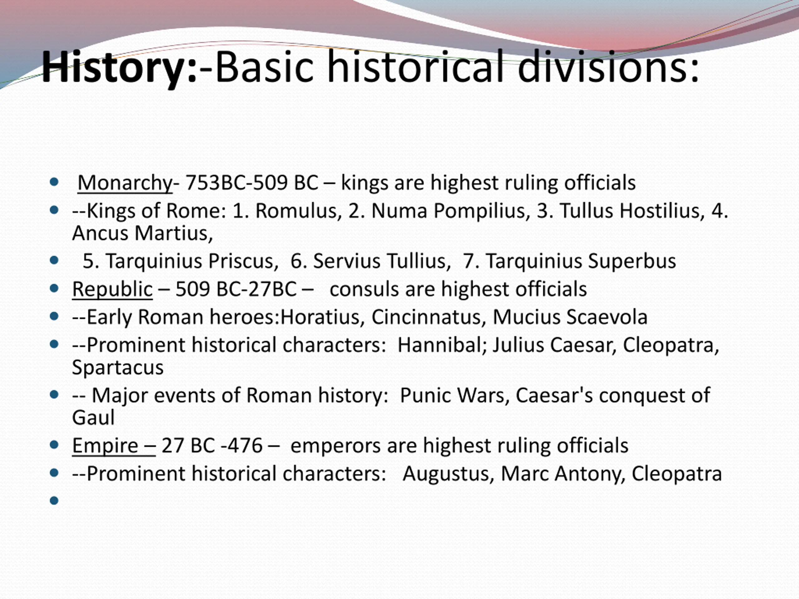 History:-Basic historical divisions: Monarchy- 753BC-509 BC kings are highest ruling officials --Kings of Rome: 1. Romulus, 2. Numa Pompilius, 3. Tullus Hostilius, 4. Ancus Martius, 5. Tarquinius Priscus, 6. Servius Tullius, 7. Tarquinius Superbus Republic 509 BC-27BC consuls are highest officials --Early Roman heroes:Horatius, Cincinnatus, Mucius Scaevola --Prominent historical characters: Hannibal; Julius Caesar, Cleopatra, Spartacus -- Major events of Roman history: Punic Wars, Caesar's conquest of Gaul Empire 27 BC -476 emperors are highest ruling officials --Prominent historical characters: Augustus, Marc Antony, Cleopatra