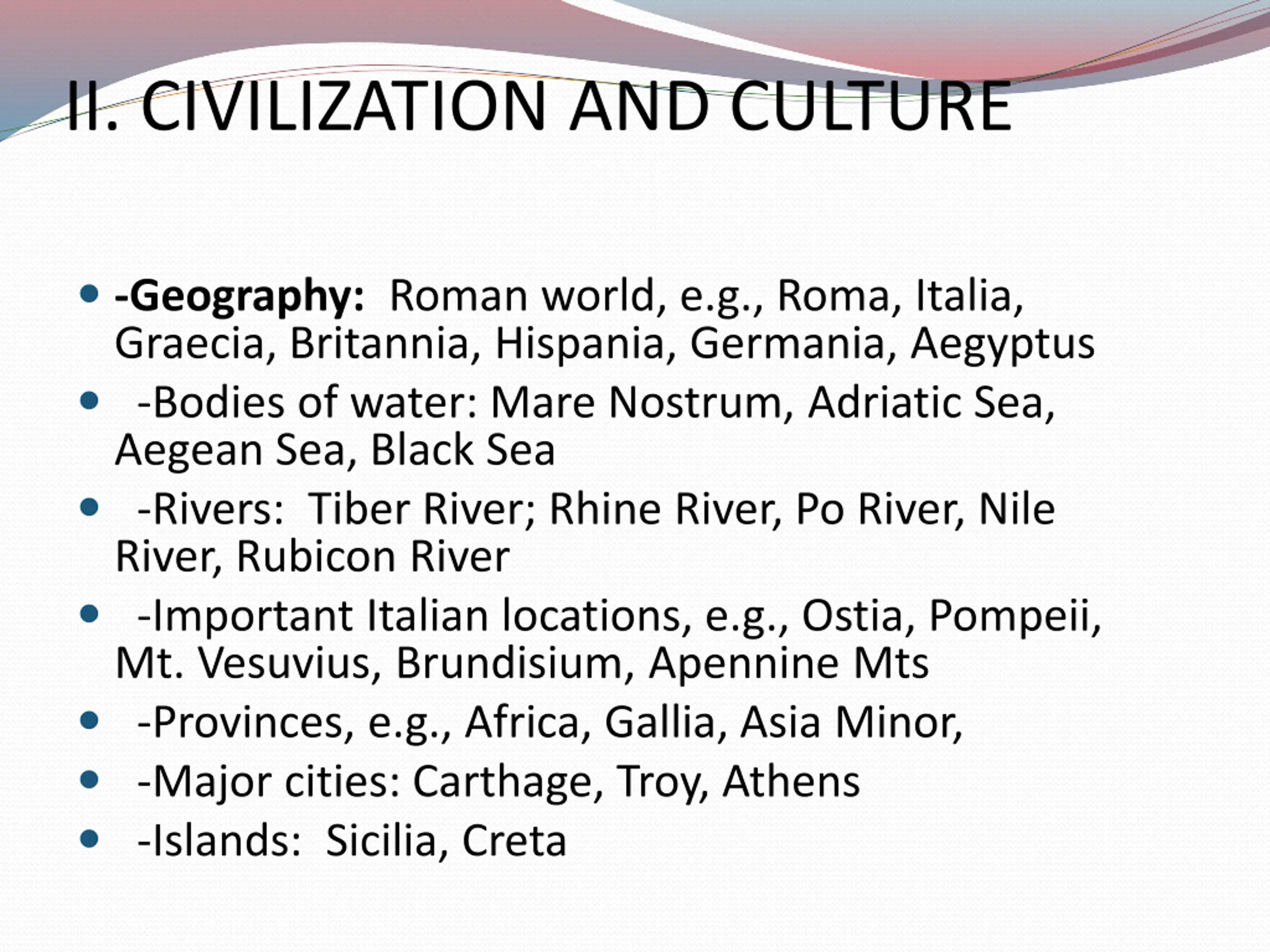 II. CIVILIZATION AND CULTURE -Geography: Roman world, e.g., Roma, Italia, Graecia, Britannia, Hispania, Germania, Aegyptus -Bodies of water: Mare Nostrum, Adriatic Sea, Aegean Sea, Black Sea -Rivers: Tiber River; Rhine River, Po River, Nile River, Rubicon River -Important Italian locations, e.g., Ostia, Pompeii, Mt. Vesuvius, Brundisium, Apennine Mts -Provinces, e.g., Africa, Gallia, Asia Minor, -Major cities: Carthage, Troy, Athens -Islands: Sicilia, Creta