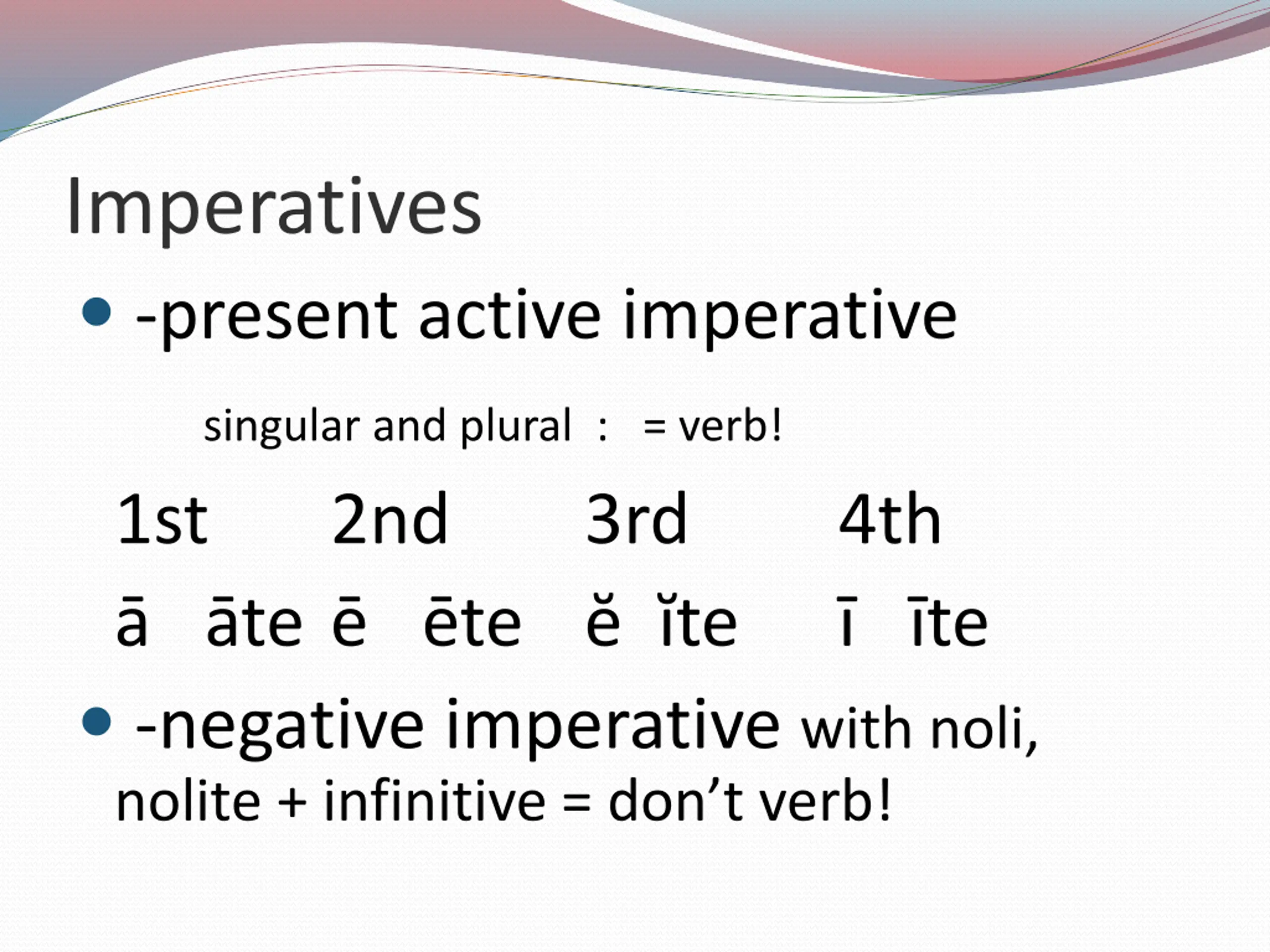 Imperatives -present active imperative singular and plural : = verb! 1st 2nd te te te te -negative imperative with noli, nolite + infinitive = don t verb! 3rd 4th