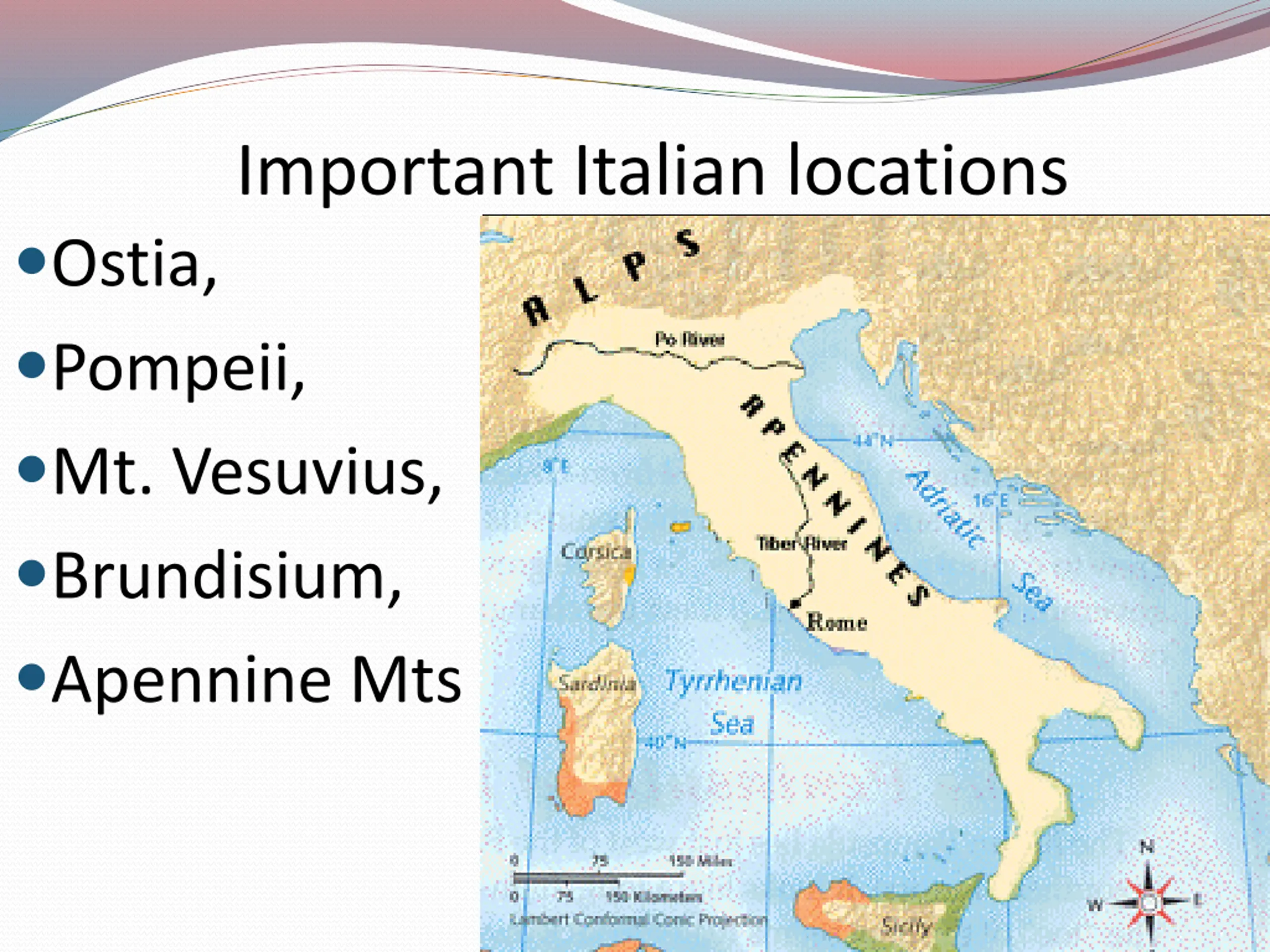 Important Italian locations Ostia, Pompeii, Mt. Vesuvius, Brundisium, Apennine Mts