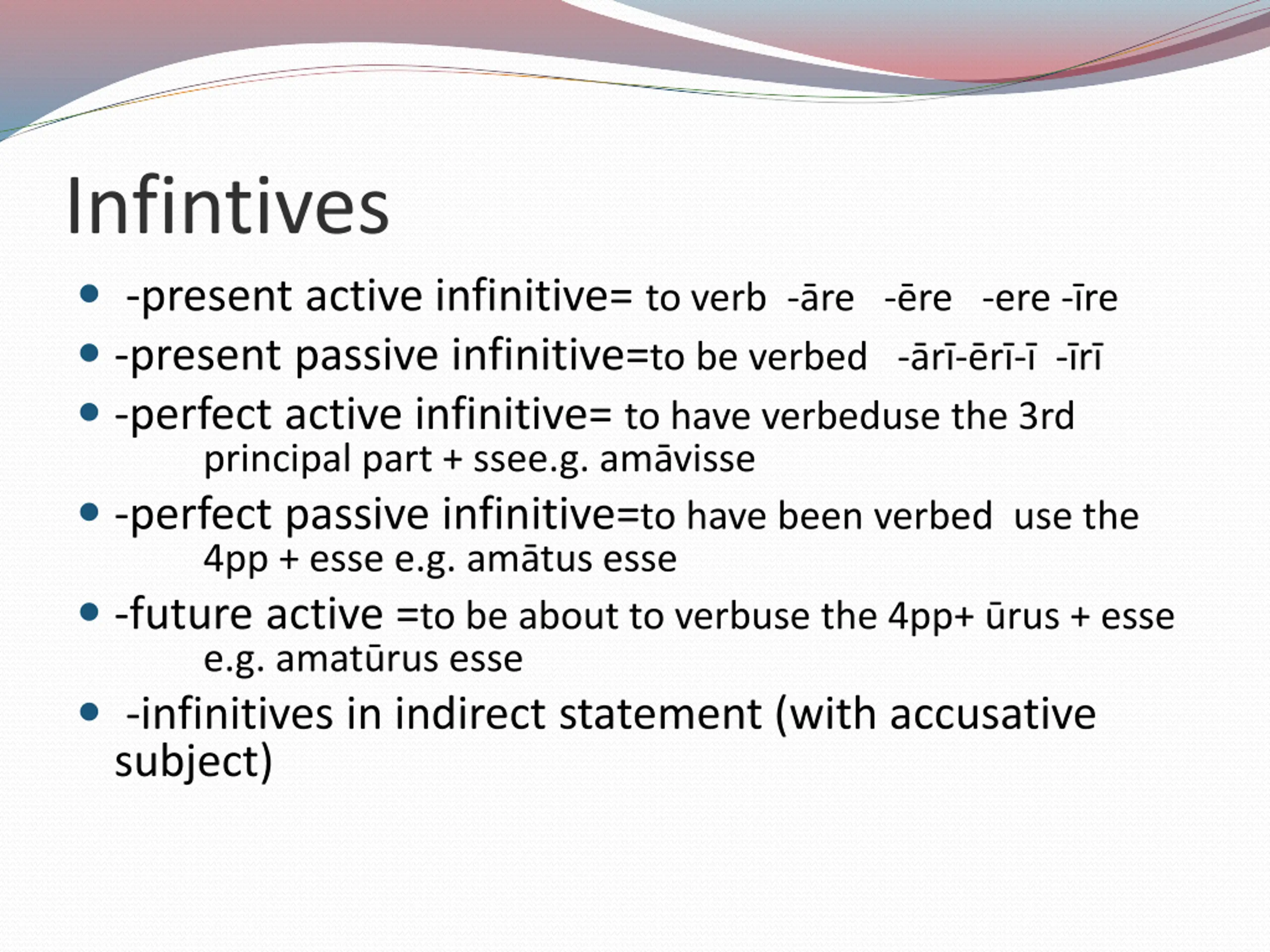 Infintives -present active infinitive= to verb - re - re -ere - re -present passive infinitive=to be verbed - r - r - - r -perfect active infinitive= to have verbeduse the 3rd principal part + ssee.g. am visse -perfect passive infinitive=to have been verbed use the 4pp + esse e.g. am tus esse -future active =to be about to verbuse the 4pp+ rus + esse e.g. amat rus esse -infinitives in indirect statement (with accusative subject)