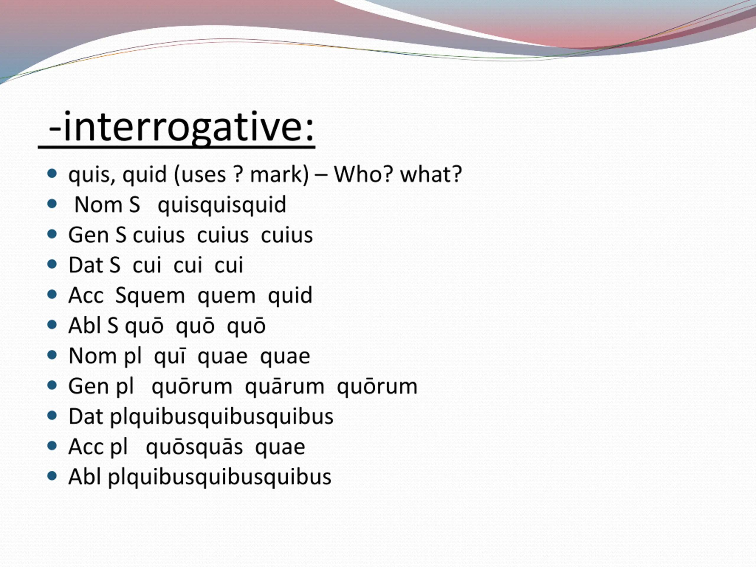 -interrogative: quis, quid (uses ? mark) Who? what? Nom S quisquisquid Gen S cuius cuius cuius Dat S cui cui cui Acc Squem quem quid Abl S qu qu qu Nom pl qu quae quae Gen pl qu rum qu rum qu rum Dat plquibusquibusquibus Acc pl qu squ s quae Abl plquibusquibusquibus