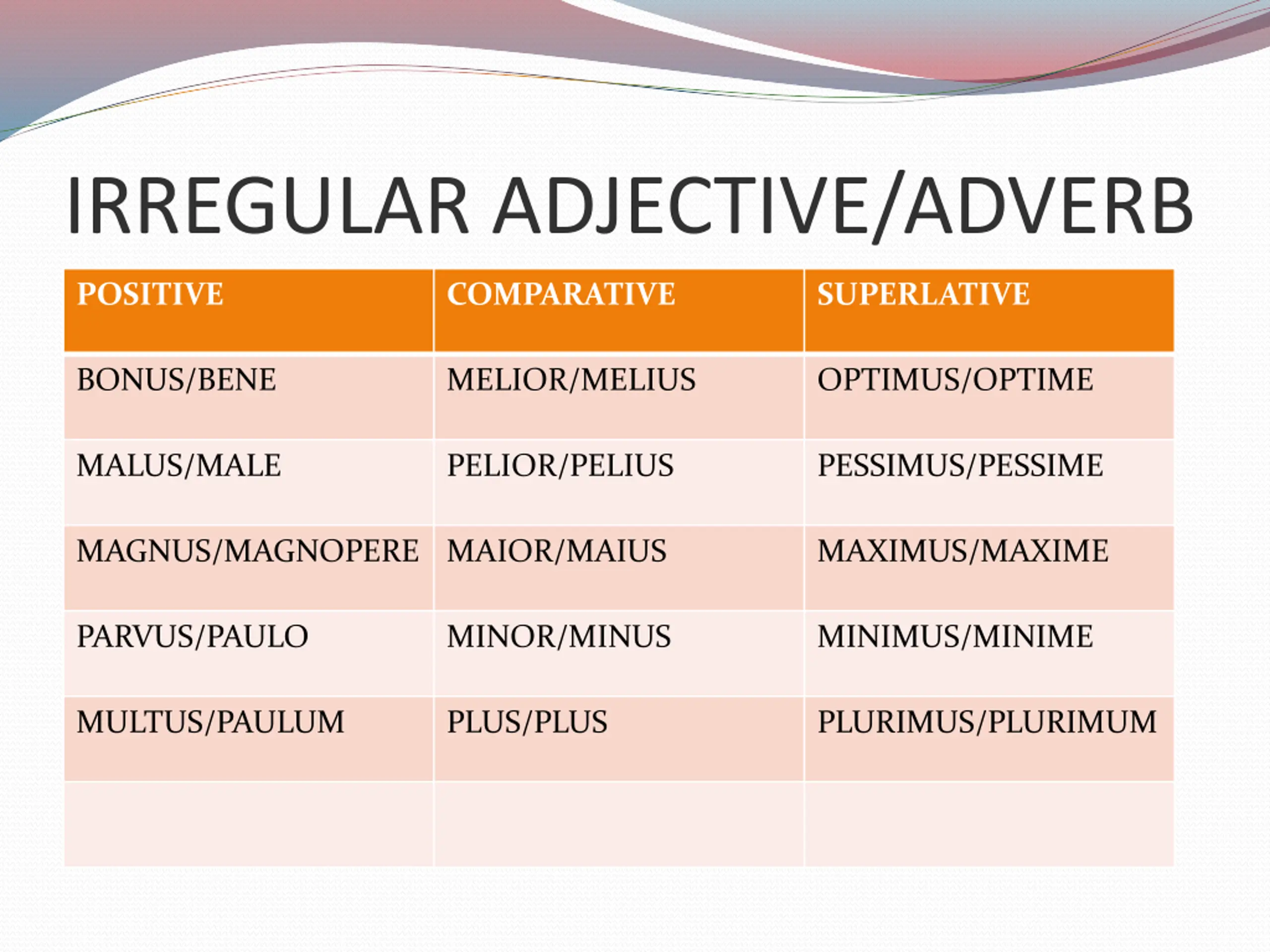 IRREGULAR ADJECTIVE/ADVERB POSITIVE COMPARATIVE SUPERLATIVE BONUS/BENE MELIOR/MELIUS OPTIMUS/OPTIME MALUS/MALE PELIOR/PELIUS PESSIMUS/PESSIME MAGNUS/MAGNOPERE MAIOR/MAIUS MAXIMUS/MAXIME PARVUS/PAULO MINOR/MINUS MINIMUS/MINIME MULTUS/PAULUM PLUS/PLUS PLURIMUS/PLURIMUM