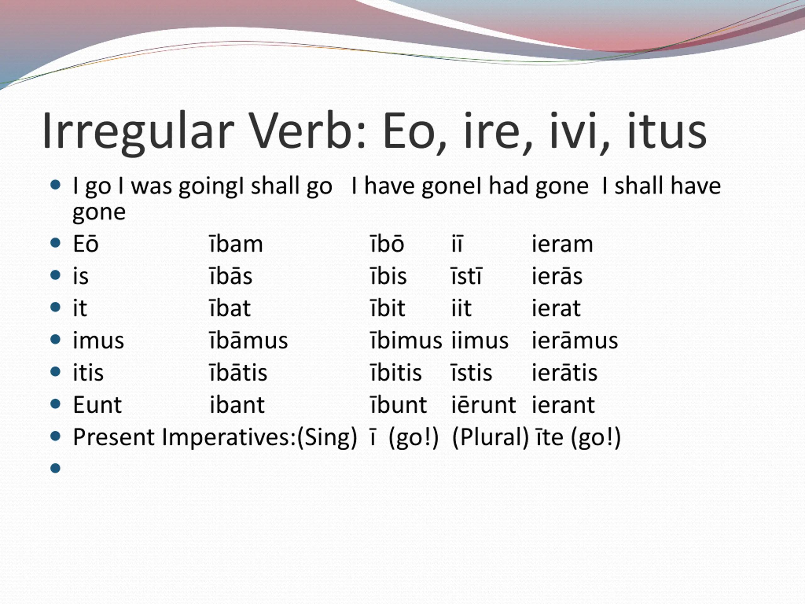 Irregular Verb: Eo, ire, ivi, itus I go I was goingI shall go I have goneI had gone I shall have gone E bam b is b s bis it bat bit imus b mus bimus iimus ier mus itis b tis bitis stis Eunt ibant bunti runt ierant Present Imperatives:(Sing) (go!) (Plural) te (go!) i st iit ieram ier s ierat ier tis