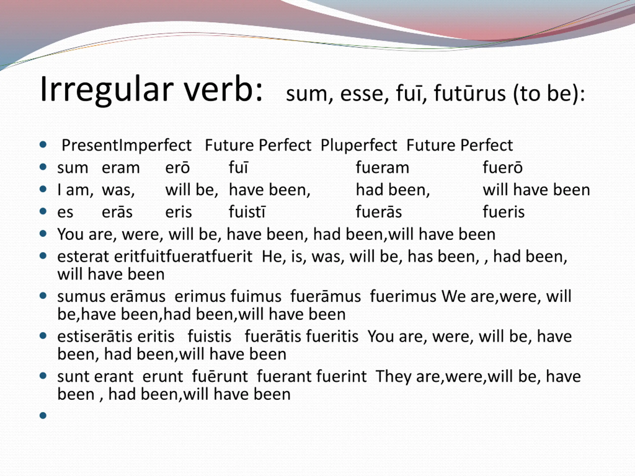 Irregular verb: sum, esse, fu, futrus (to be): PresentImperfect Future Perfect Pluperfect Future Perfect sum eram er fu I am, was, will be, have been, es er s eris fuist You are, were, will be, have been, had been,will have been esterat eritfuitfueratfuerit He, is, was, will be, has been, , had been, will have been sumus er mus erimus fuimus fuer mus fuerimus We are,were, will be,have been,had been,will have been estiser tis eritis fuistis fuer tis fueritis You are, were, will be, have been, had been,will have been sunt erant erunt fu runt fuerant fuerint They are,were,will be, have been , had been,will have been fueram had been, fuer s fuer will have been fueris