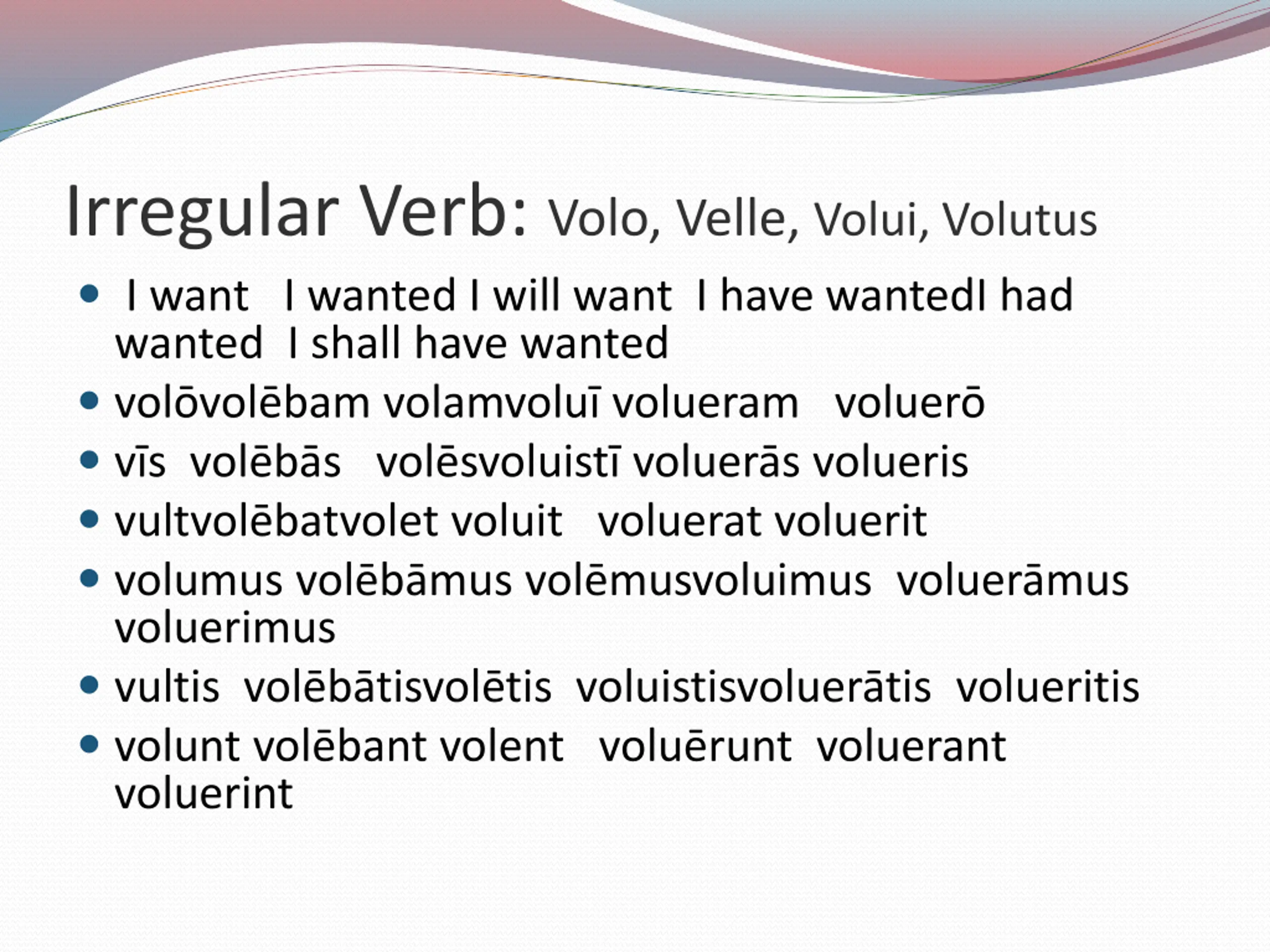 Irregular Verb: Volo, Velle, Volui, Volutus I want I wanted I will want I have wantedI had wanted I shall have wanted vol vol bamvolamvolu volueram voluer v svol b svol svoluist voluer s volueris vultvol batvolet voluit voluerat voluerit volumus vol b musvol musvoluimusvoluer mus voluerimus vultis vol b tisvol tisvoluistisvoluer tis volueritis volunt vol bant volent volu runt voluerant voluerint