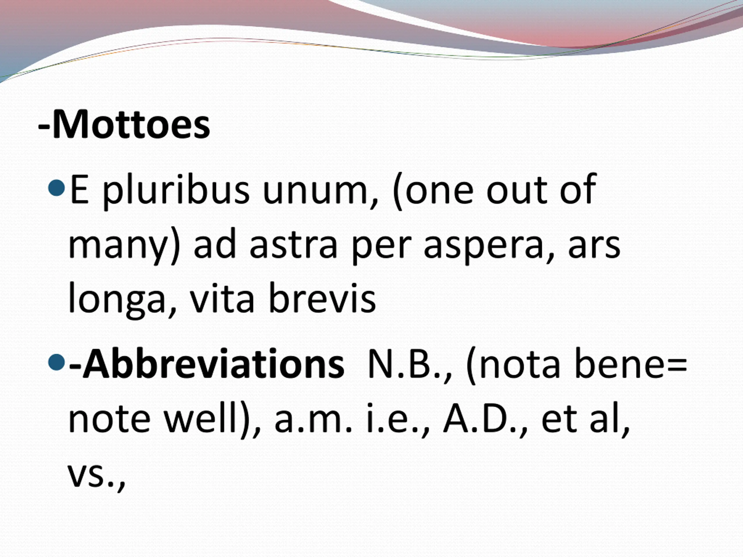 -Mottoes E pluribus unum, (one out of many) ad astra per aspera, ars longa, vita brevis -Abbreviations N.B., (nota bene= note well), a.m. i.e., A.D., et al, vs.,