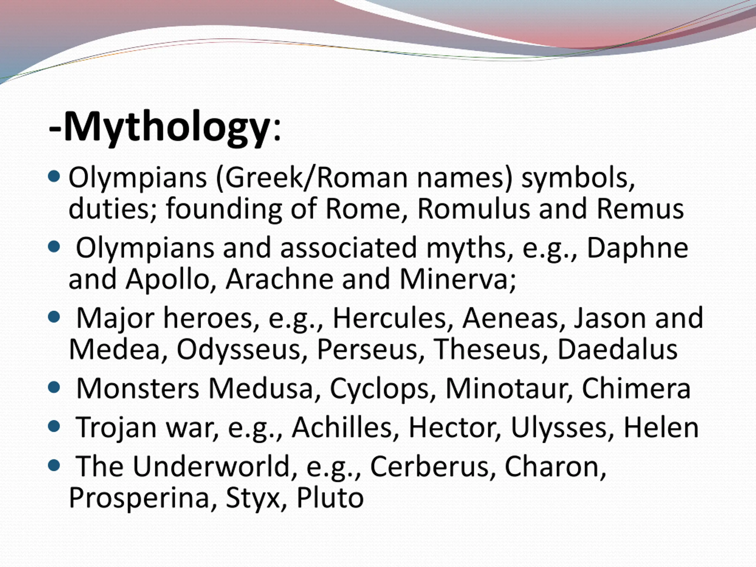 -Mythology: Olympians (Greek/Roman names) symbols, duties; founding of Rome, Romulus and Remus Olympians and associated myths, e.g., Daphne and Apollo, Arachne and Minerva; Major heroes, e.g., Hercules, Aeneas, Jason and Medea, Odysseus, Perseus, Theseus, Daedalus Monsters Medusa, Cyclops, Minotaur, Chimera Trojan war, e.g., Achilles, Hector, Ulysses, Helen The Underworld, e.g., Cerberus, Charon, Prosperina, Styx, Pluto