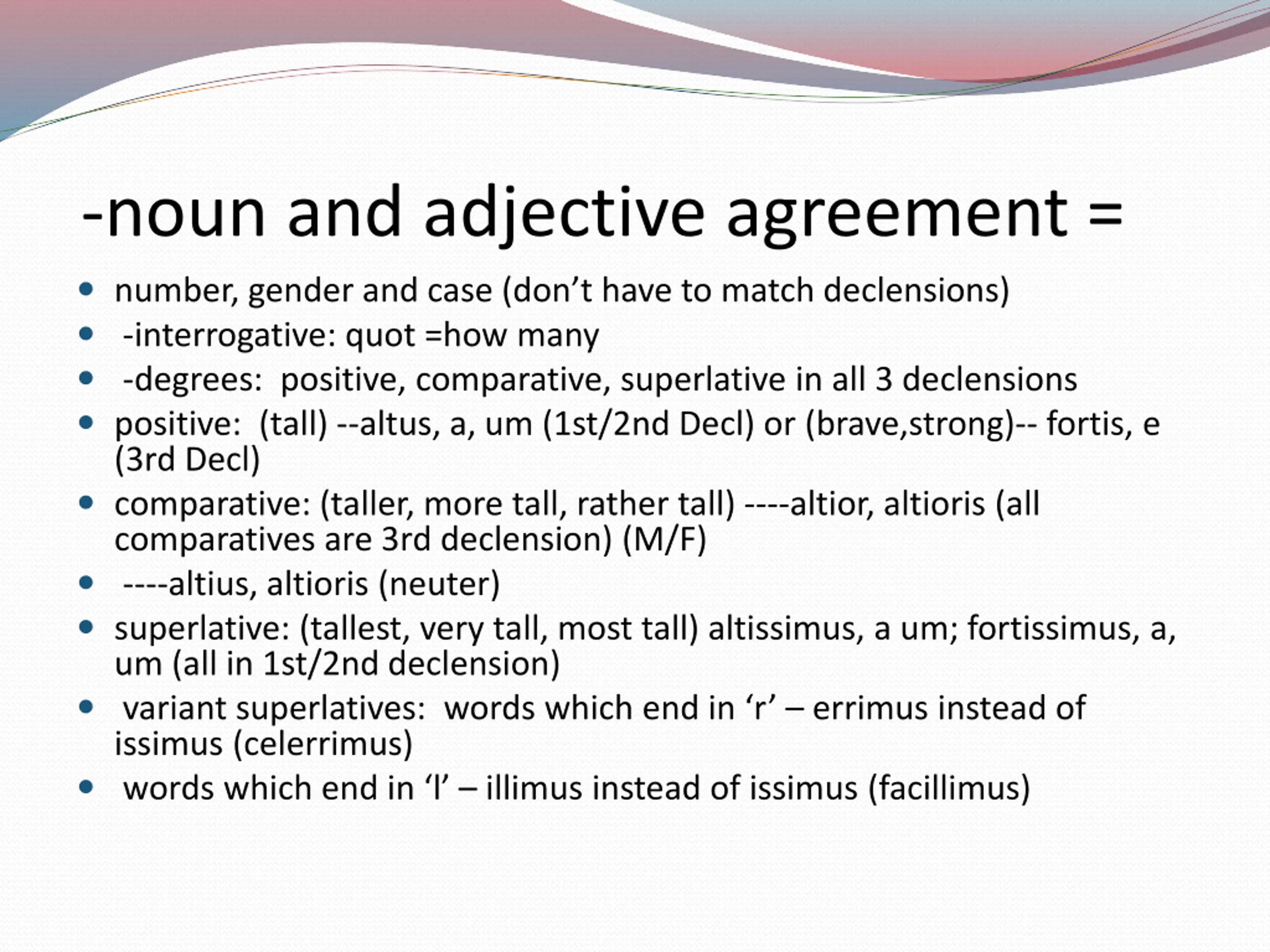 -noun and adjective agreement = number, gender and case (don t have to match declensions) -interrogative: quot =how many -degrees: positive, comparative, superlative in all 3 declensions positive: (tall) --altus, a, um (1st/2nd Decl) or (brave,strong)-- fortis, e (3rd Decl) comparative: (taller, more tall, rather tall) ----altior, altioris (all comparatives are 3rd declension) (M/F) ----altius, altioris (neuter) superlative: (tallest, very tall, most tall) altissimus, a um; fortissimus, a, um (all in 1st/2nd declension) variant superlatives: words which end in r errimus instead of issimus (celerrimus) words which end in l illimus instead of issimus (facillimus)