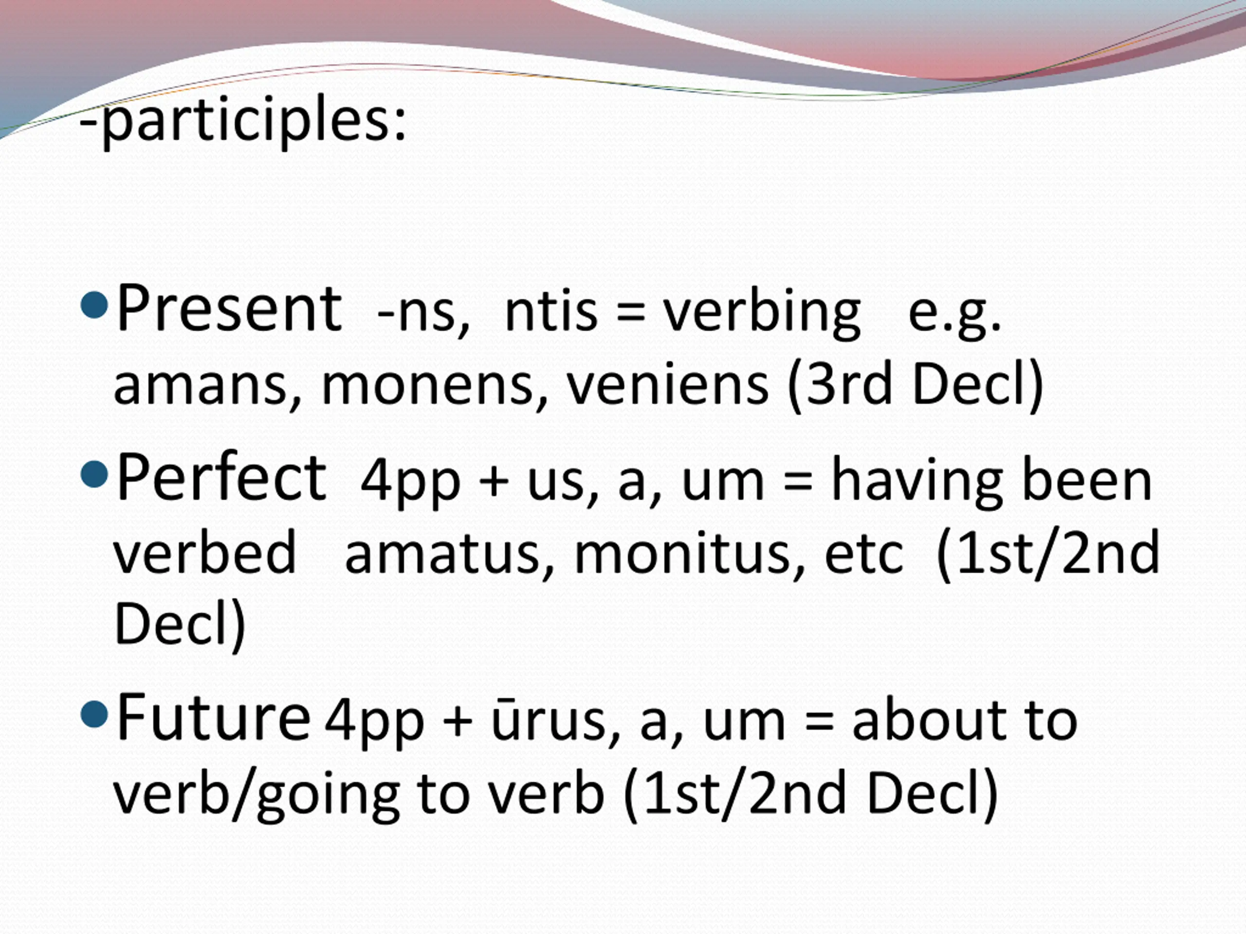 -participles: Present-ns, ntis = verbing e.g. amans, monens, veniens (3rd Decl) Perfect4pp + us, a, um = having been verbed amatus, monitus, etc (1st/2nd Decl) Future4pp + rus, a, um = about to verb/going to verb (1st/2nd Decl)