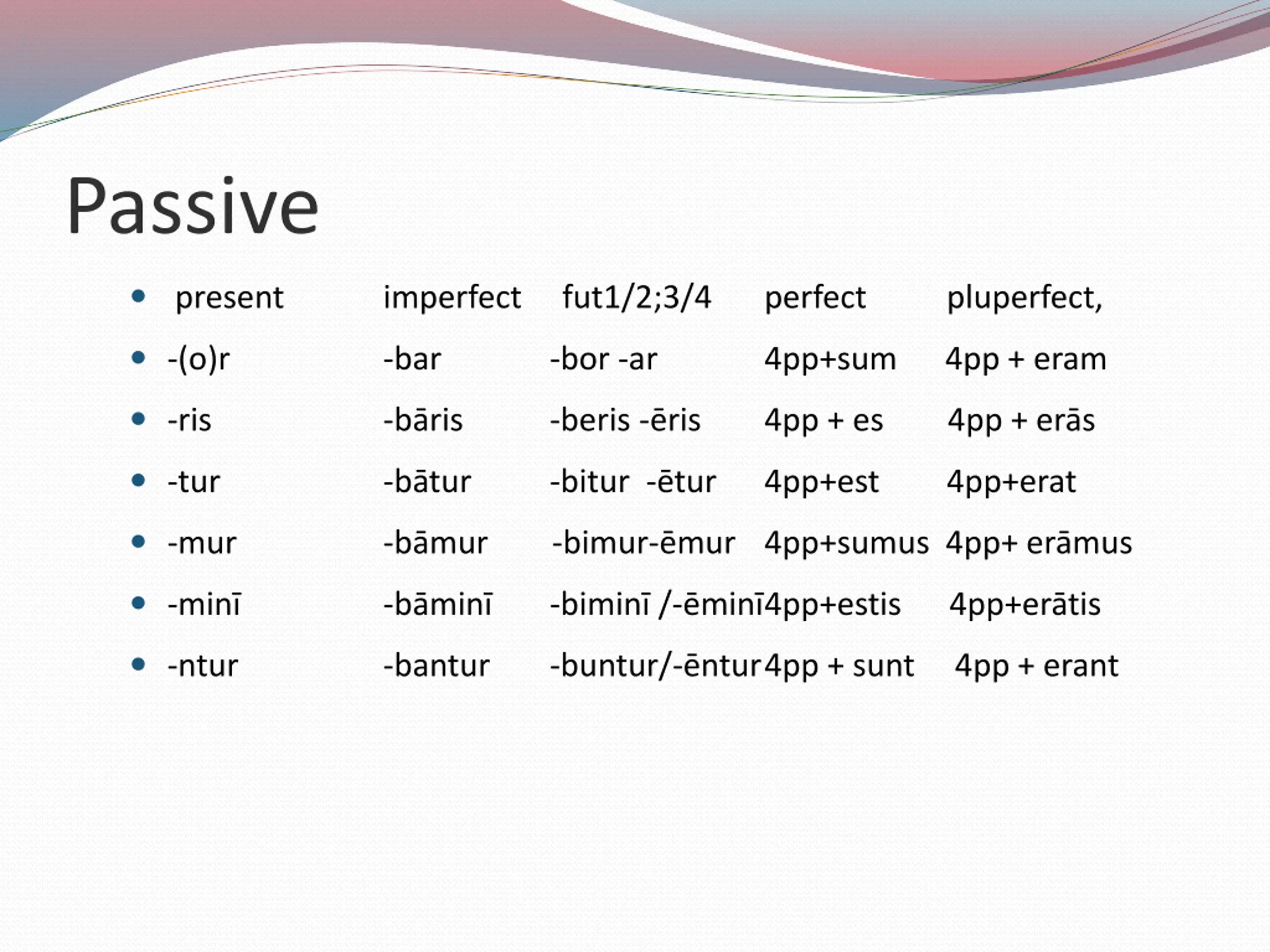 Passive present imperfect fut1/2;3/4 perfect pluperfect, -(o)r -bar -bor -ar 4pp+sum 4pp + eram -ris -b ris -beris - ris 4pp + es 4pp + er s -tur -b tur -bitur - tur 4pp+est 4pp+erat -mur -b mur -bimur- mur 4pp+sumus 4pp+ er mus -min -b min -bimin /- min 4pp+estis 4pp+er tis -ntur -bantur -buntur/- ntur 4pp + sunt 4pp + erant