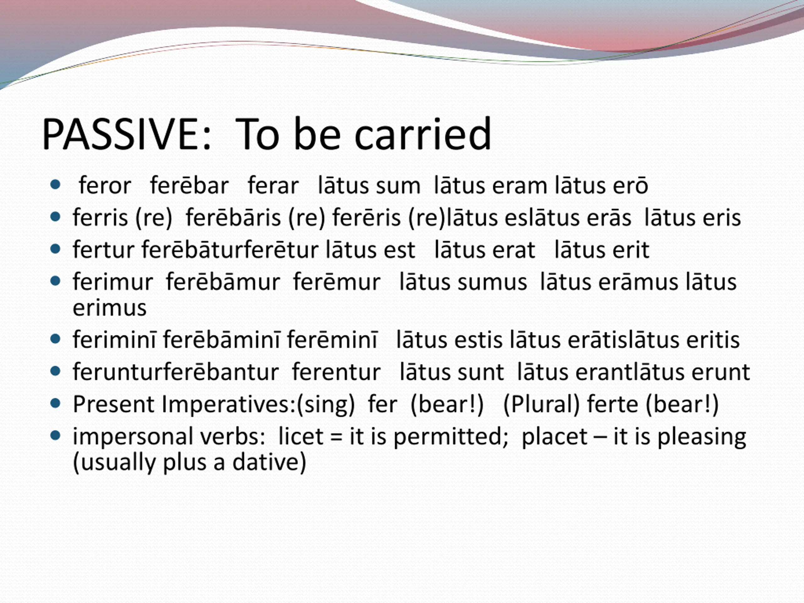 PASSIVE: To be carried feror fer bar ferar l tus sum l tus eram l tuser ferris (re) fer b ris (re) fer ris (re)l tusesl tuser sl tus eris fertur fer b turfer turl tus est l tus erat l tus erit ferimur fer b murfer murl tus sumus l tuser musl tus erimus ferimin fer b min fer min l tus estis l tuser tisl tus eritis ferunturfer bantur ferentur l tus sunt l tuserantl tus erunt Present Imperatives:(sing) fer (bear!) (Plural) ferte (bear!) impersonal verbs: licet = it is permitted; placet it is pleasing (usually plus a dative)