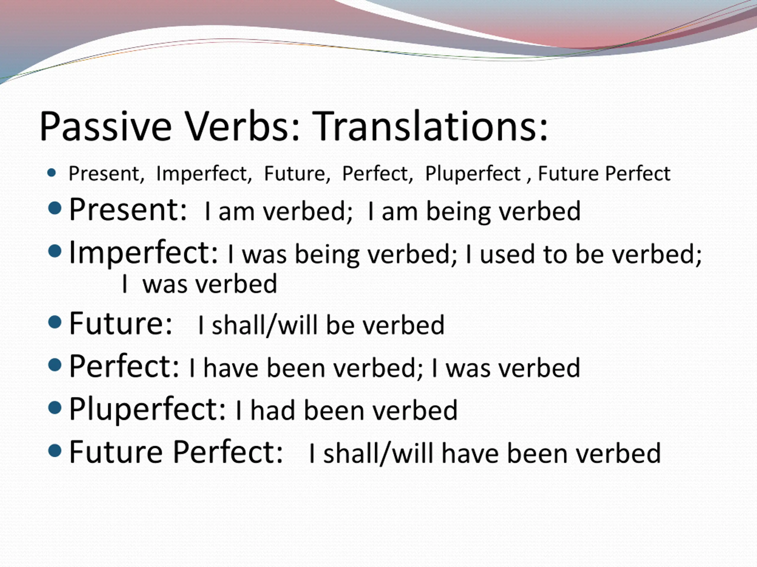 Passive Verbs: Translations: Present, Imperfect, Future, Perfect, Pluperfect , Future Perfect Present: I am verbed; I am being verbed Imperfect: I was being verbed; I used to be verbed; I was verbed Future: I shall/will be verbed Perfect: I have been verbed; I was verbed Pluperfect: I had been verbed Future Perfect: I shall/will have been verbed