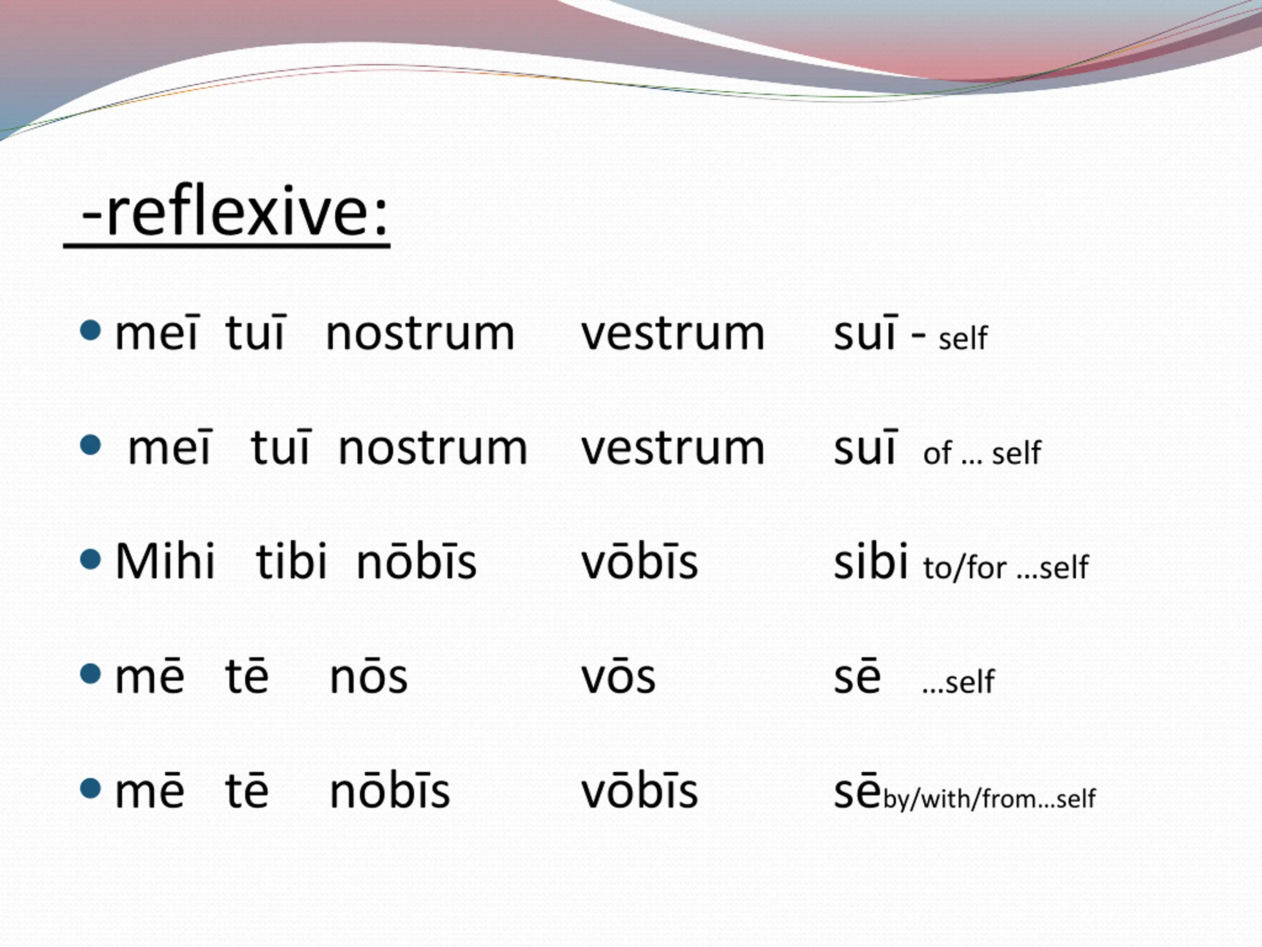 -reflexive: me tu nostrum vestrum su - self me tu nostrum vestrum su of self Mihi tibi n b s v b s sibi to/for self m t n s v s s self m t n b s v b s s by/with/from self