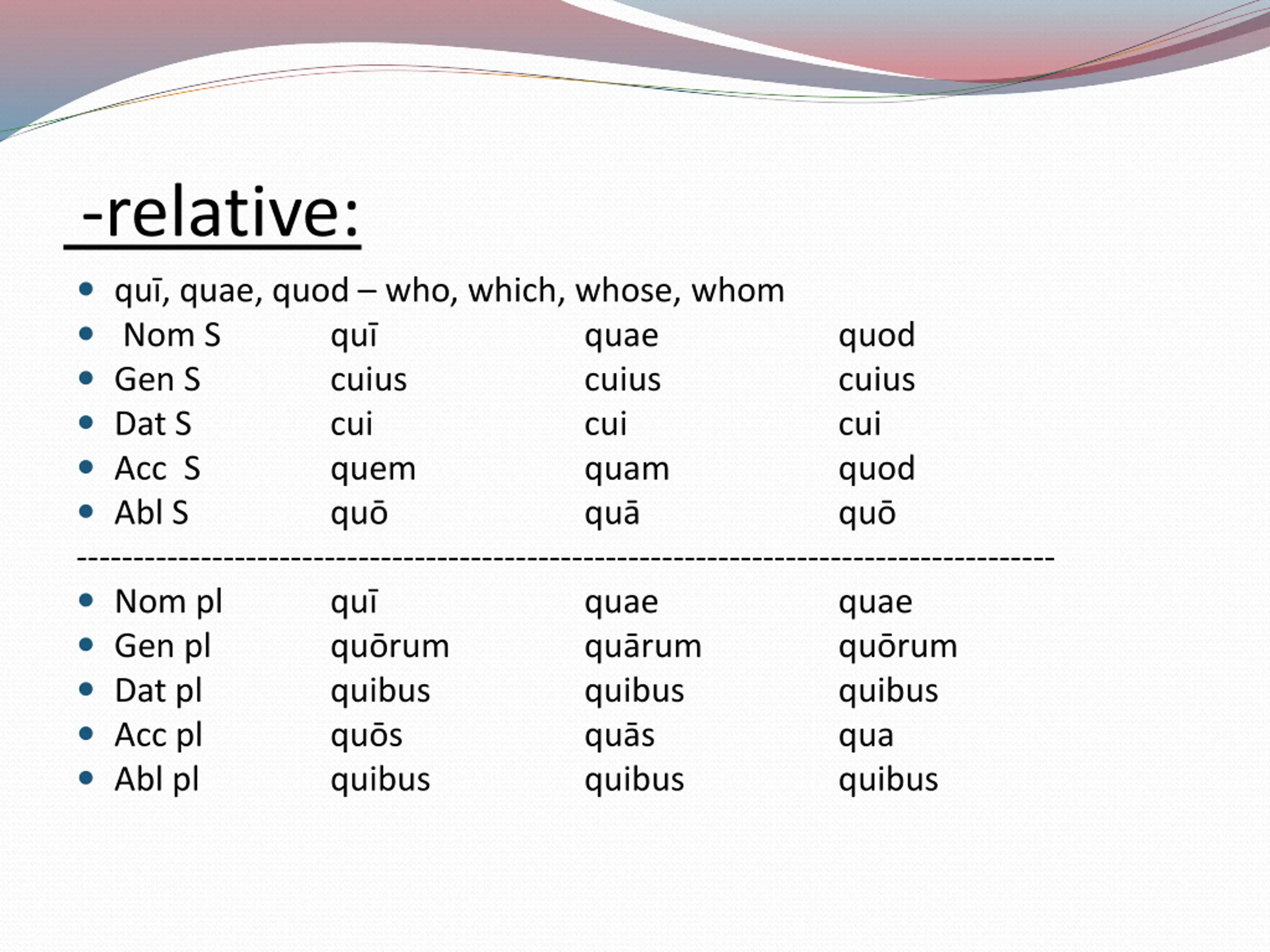 -relative: qu , quae, quod who, which, whose, whom Nom S qu Gen S cuius Dat S cui Acc S quem Abl S qu --------------------------------------------------------------------------------------- Nom pl qu Gen pl qu rum Dat pl quibus Acc pl qu s Abl pl quibus quae cuius cui quam qu quod cuius cui quod qu quae qu rum quibus qu s quibus quae qu rum quibus qua quibus
