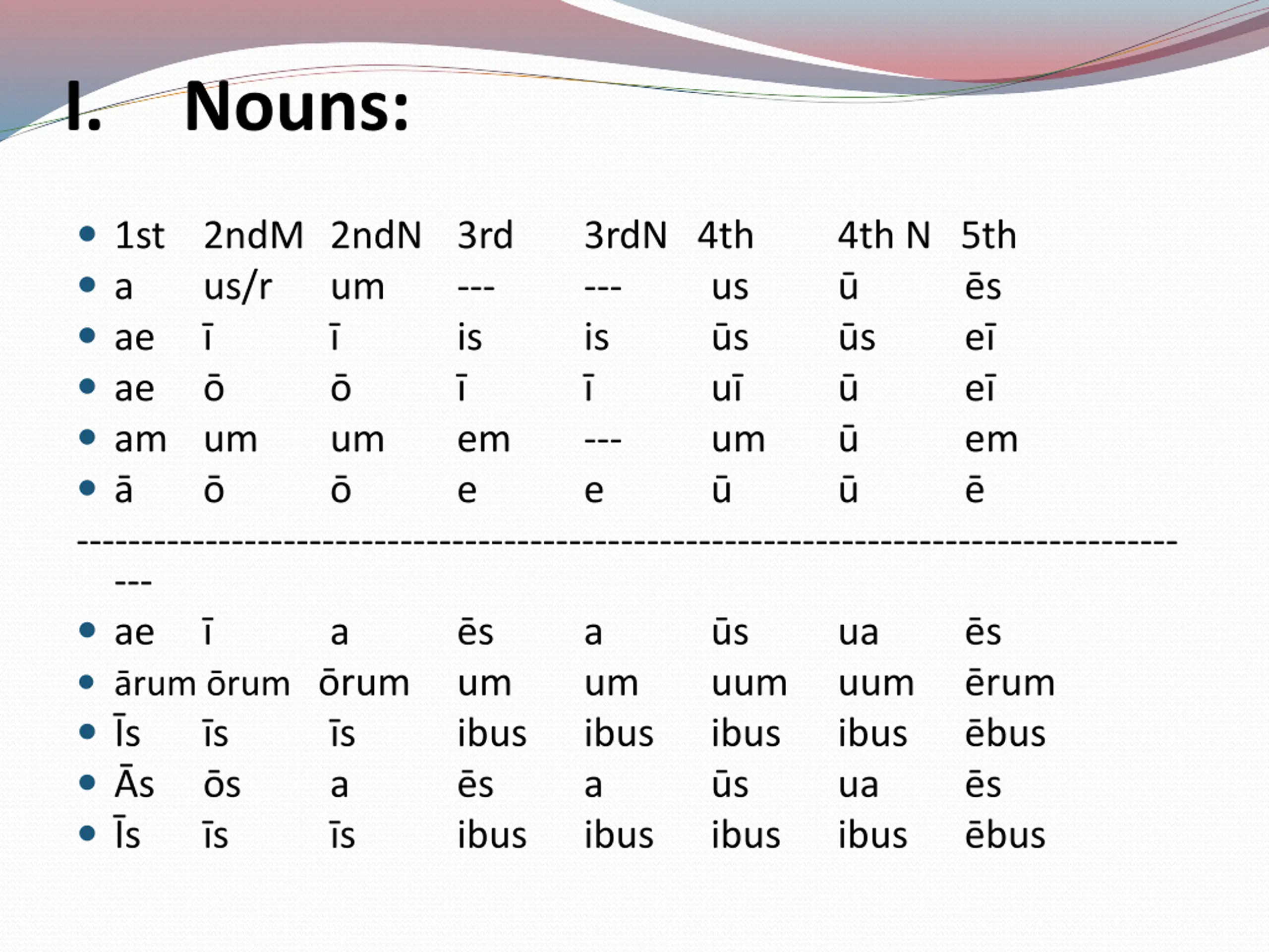 I. Nouns: 1st 2ndM 2ndN 3rd a us/r um ae ae am um ------------------------------------------------------------------------------------- --- ae a s a rum rum rum um um s s s ibus ibus s s a s a s s s ibus ibus 3rdN 4th --- is --- e 4th N 5th s --- is em e us s u um s e e em um s uum ibus s ibus ua uum ibus ua ibus s rum bus s bus