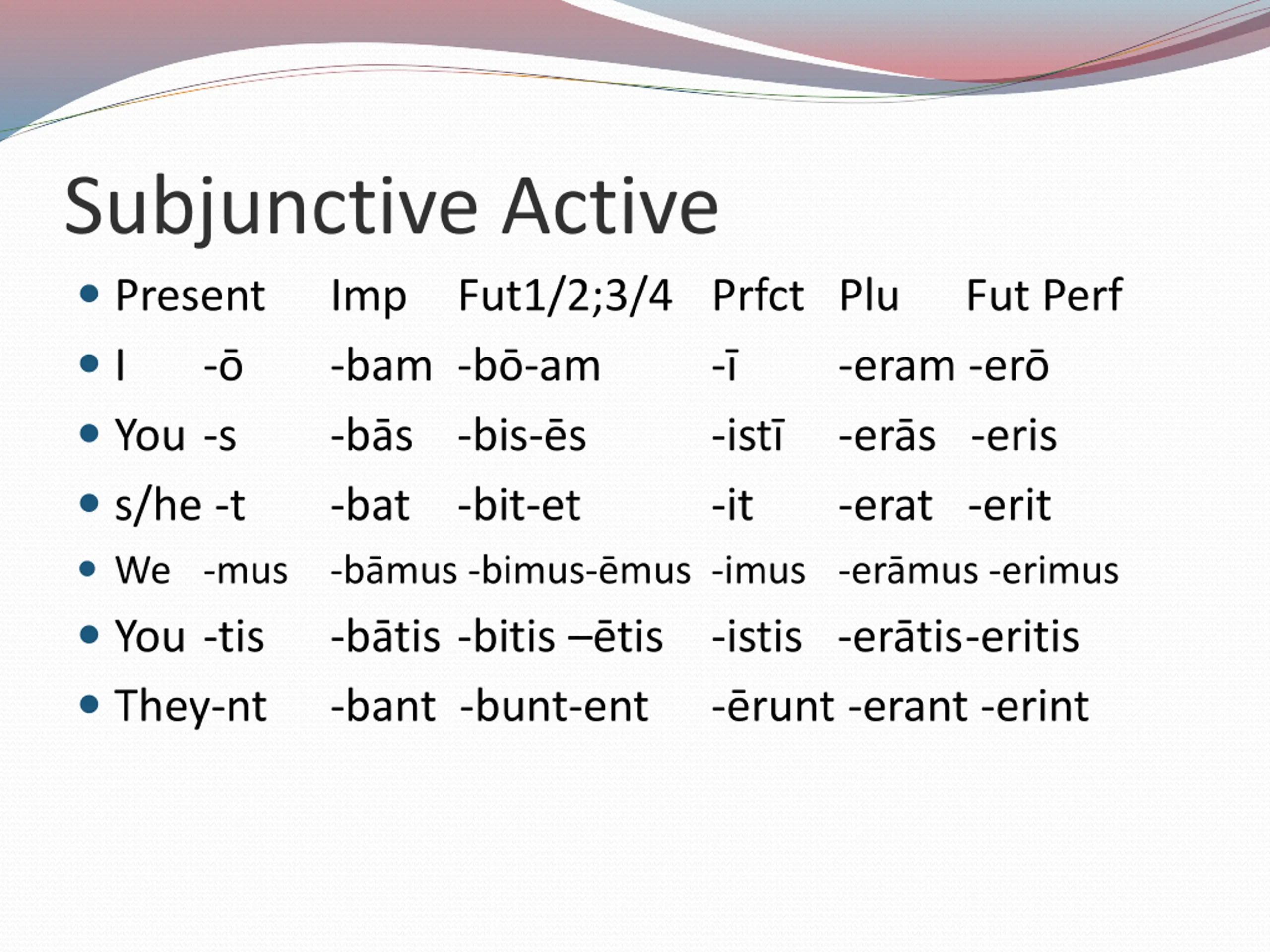 Subjunctive Active Present Imp Fut1/2;3/4 Prfct Plu I - -bam -b -am You -s -b s -bis- s s/he -t -bat -bit-et We -mus -b mus -bimus- mus -imus -er mus -erimus You -tis -b tis -bitis tis -istis -er tis -eritis They-nt -bant -bunt-ent Fut Perf - -ist -er s -eris -it -erat -erit -eram -er - runt -erant -erint