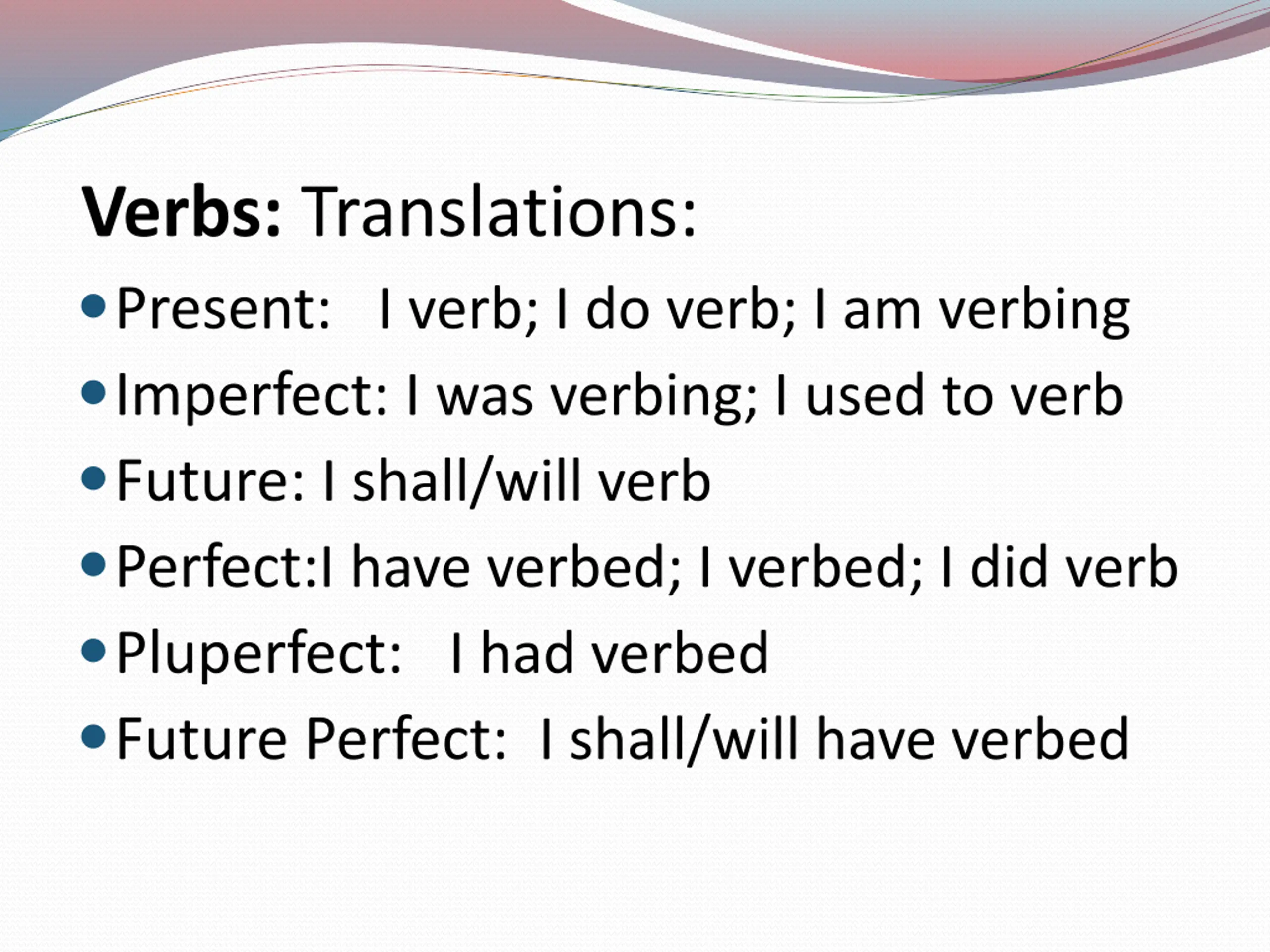 Verbs: Translations: Present: I verb; I do verb; I am verbing Imperfect: I was verbing; I used to verb Future: I shall/will verb Perfect:I have verbed; I verbed; I did verb Pluperfect: I had verbed Future Perfect: I shall/will have verbed