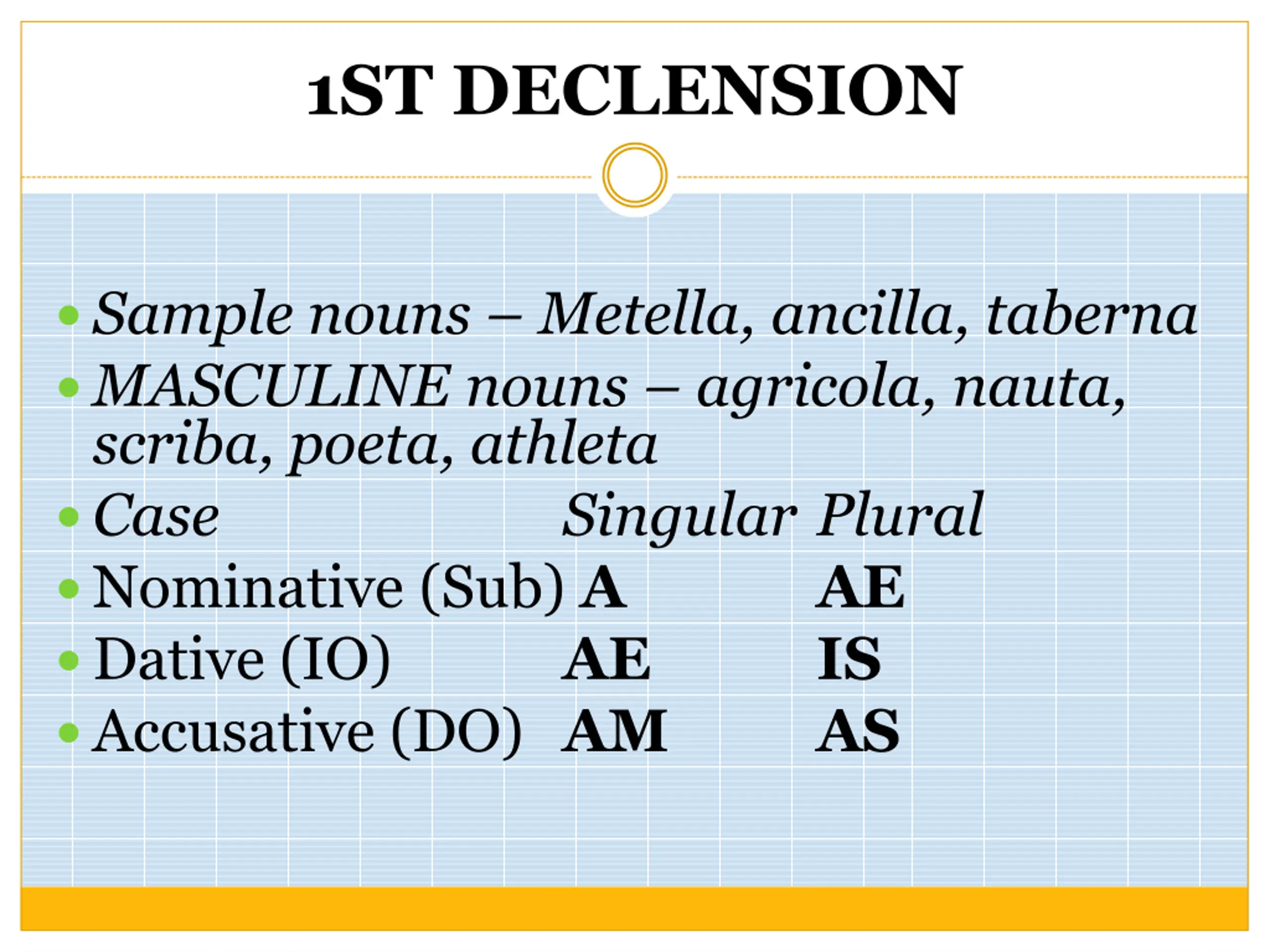 1ST DECLENSION Sample nouns Metella, ancilla, taberna MASCULINE nouns agricola, nauta, scriba, poeta, athleta Case Singular Plural Nominative (Sub) A Dative (IO) AE Accusative (DO) AM AE IS AS