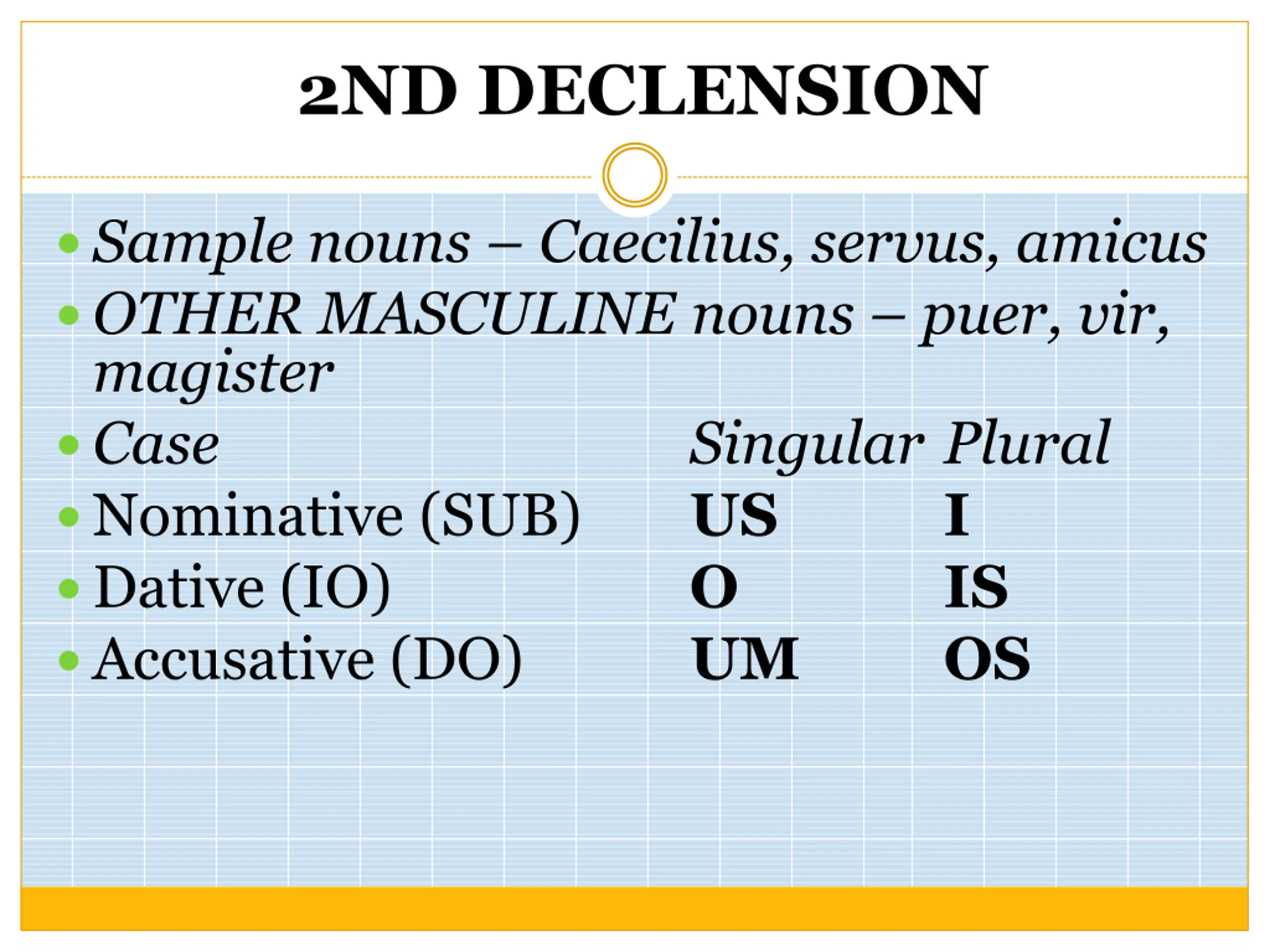 2ND DECLENSION Sample nouns Caecilius, servus, amicus OTHER MASCULINE nouns puer, vir, magister Case Nominative (SUB) Dative (IO) Accusative (DO) Singular Plural US O UM I IS OS