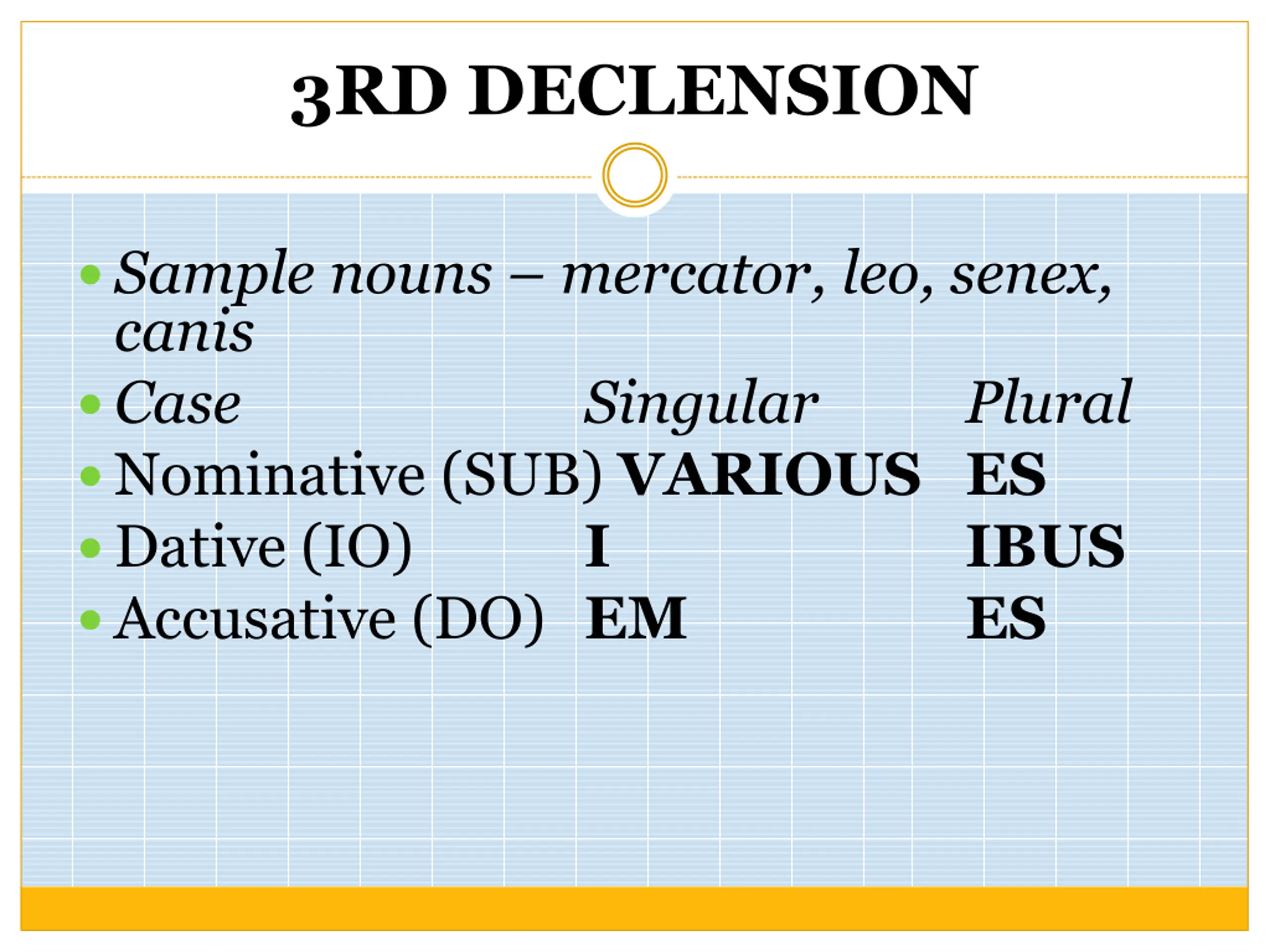 3RD DECLENSION Sample nouns mercator, leo, senex, canis Case Singular Nominative (SUB) VARIOUS ES Dative (IO) I Accusative (DO) EM Plural IBUS ES