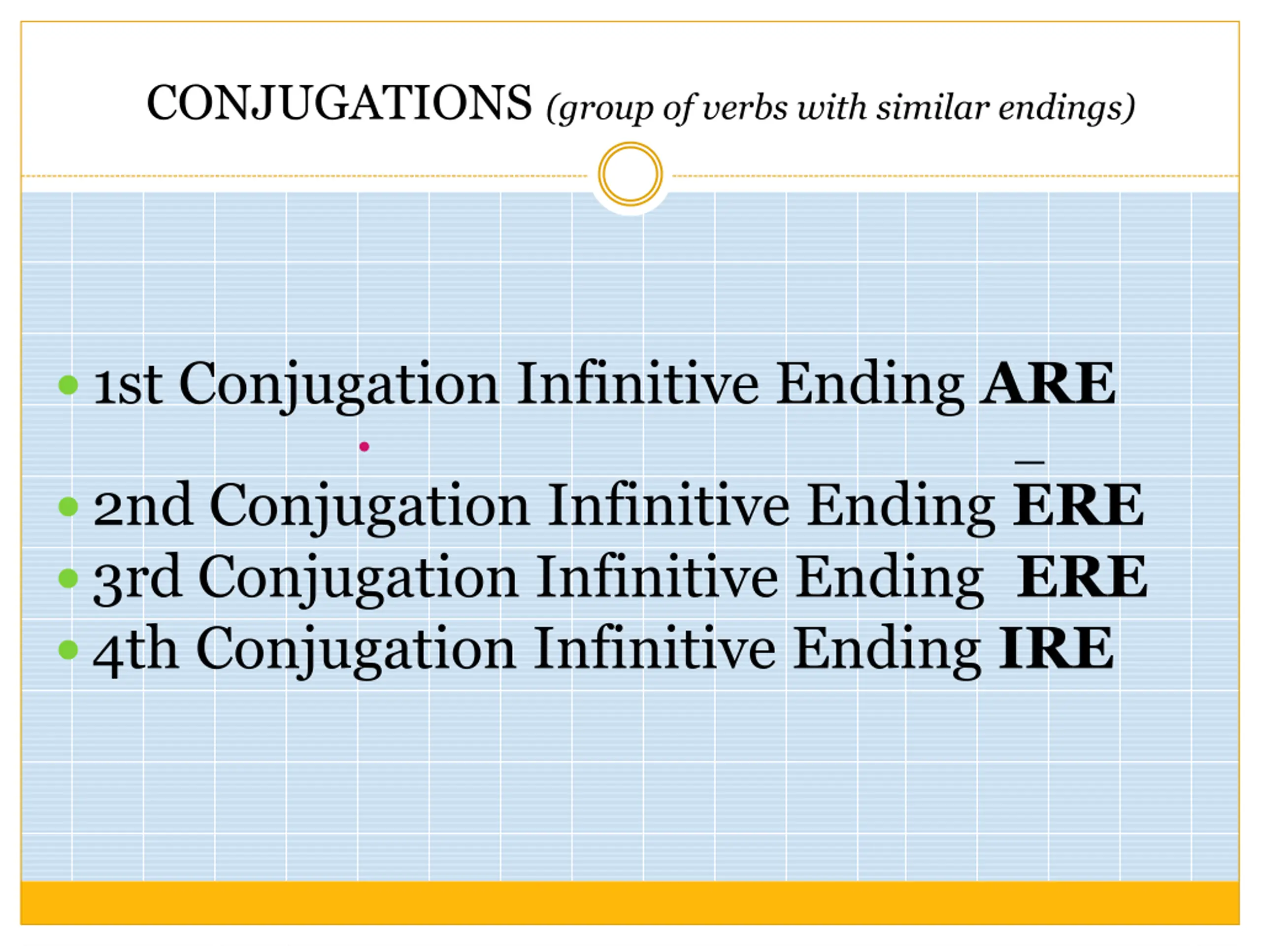 CONJUGATIONS (group of verbs with similar endings) 1st Conjugation Infinitive Ending ARE 2nd Conjugation Infinitive Ending ERE 3rd Conjugation Infinitive Ending ERE 4th Conjugation Infinitive Ending IRE _
