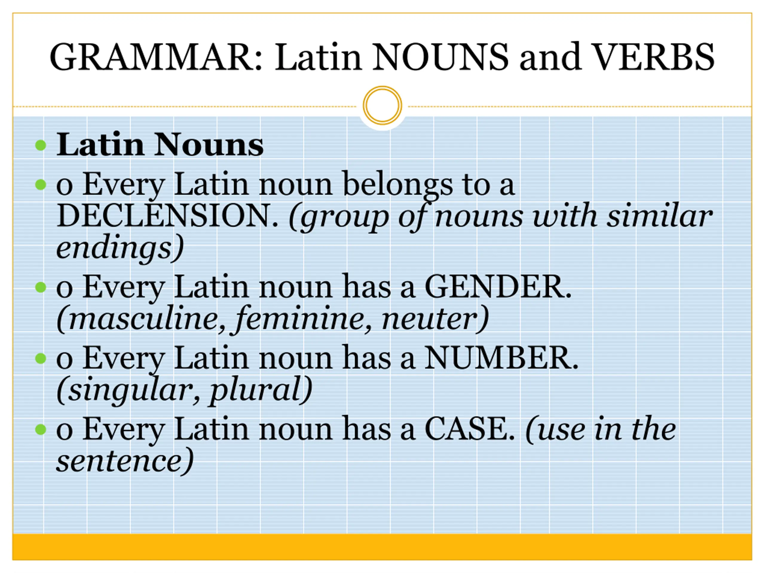GRAMMAR: Latin NOUNS and VERBS Latin Nouns o Every Latin noun belongs to a DECLENSION. (group of nouns with similar endings) o Every Latin noun has a GENDER. (masculine, feminine, neuter) o Every Latin noun has a NUMBER. (singular, plural) o Every Latin noun has a CASE. (use in the sentence)