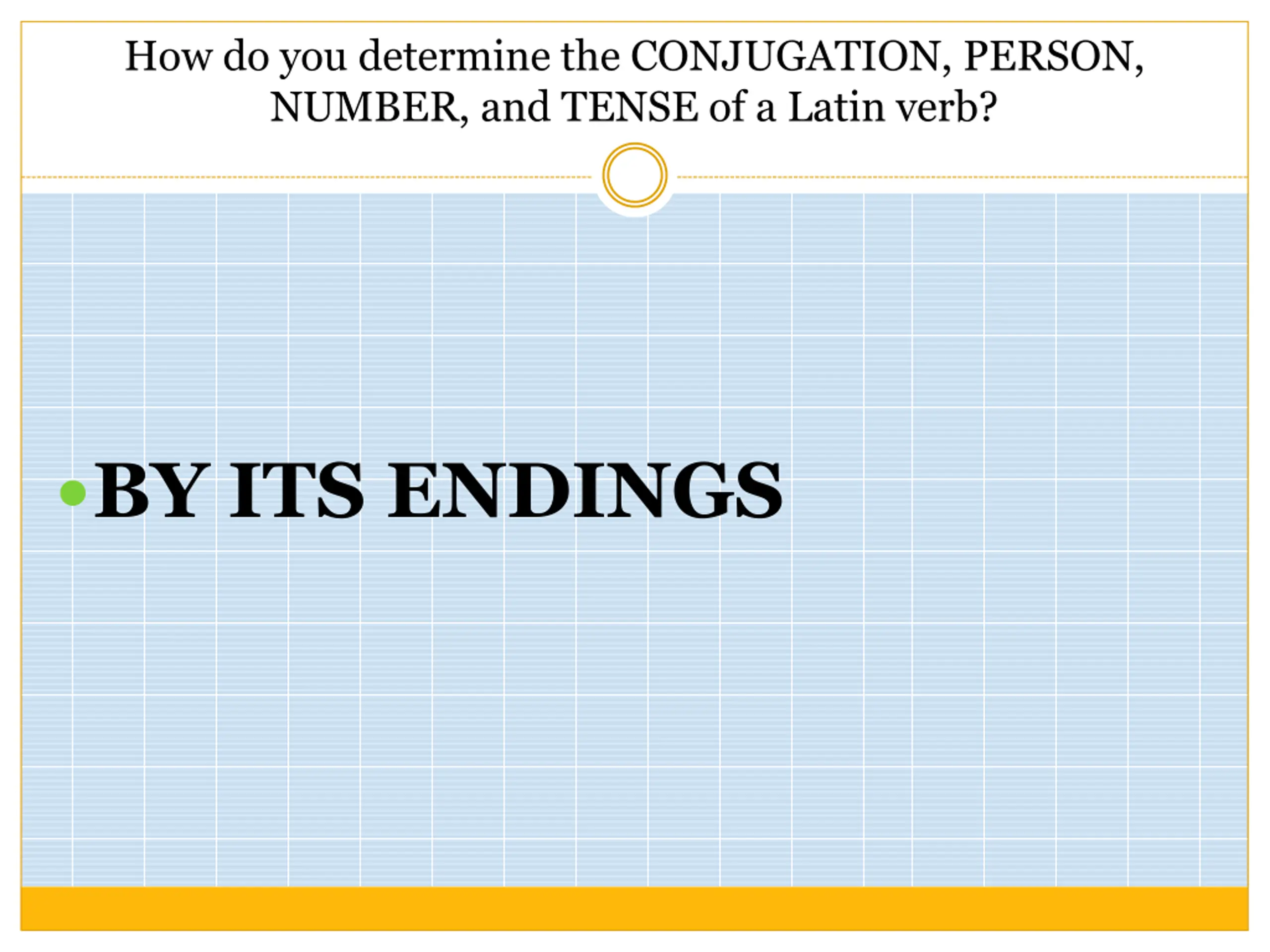 How do you determine the CONJUGATION, PERSON, NUMBER, and TENSE of a Latin verb? BY ITS ENDINGS