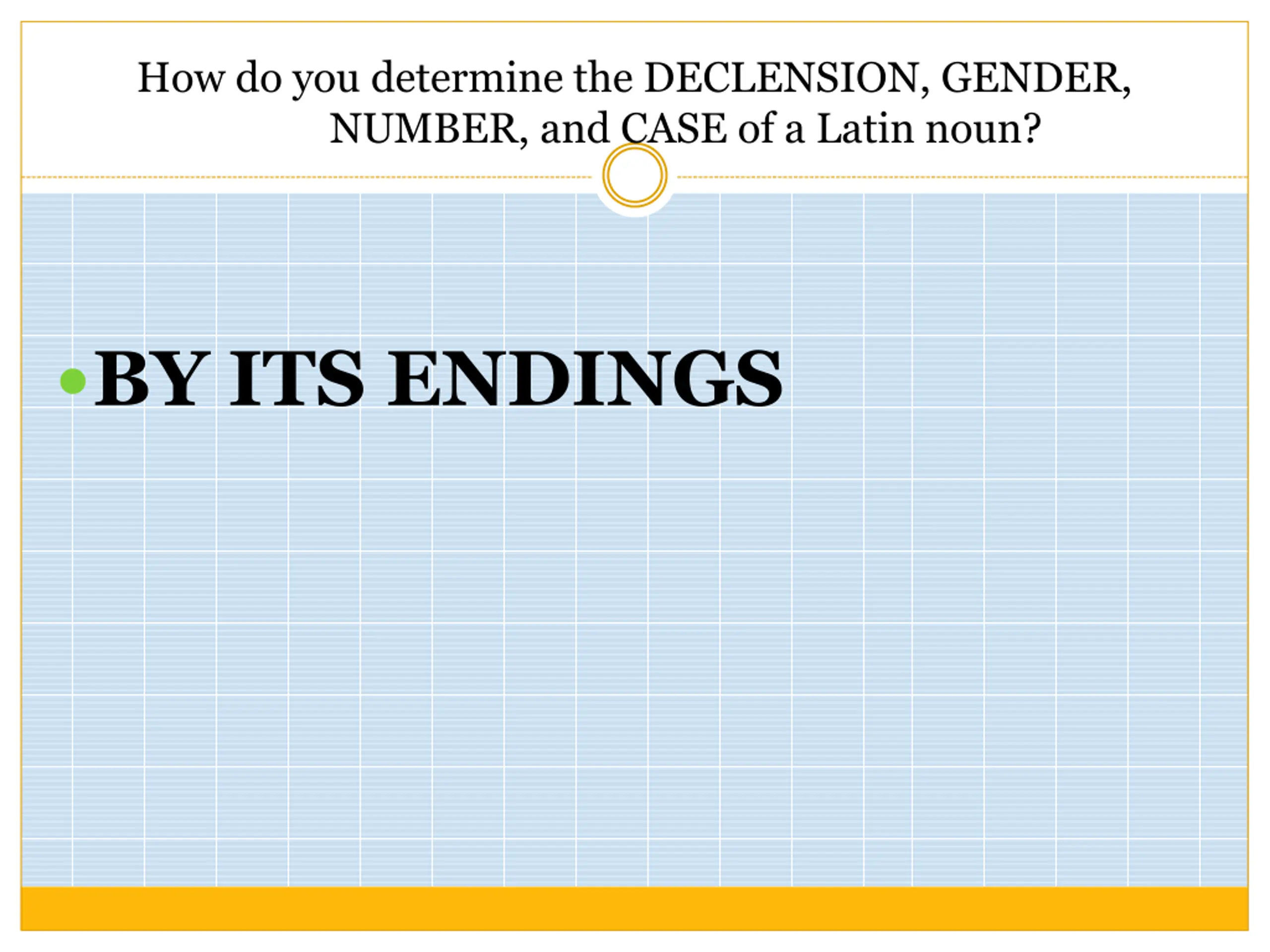 How do you determine the DECLENSION, GENDER, NUMBER, and CASE of a Latin noun? BY ITS ENDINGS