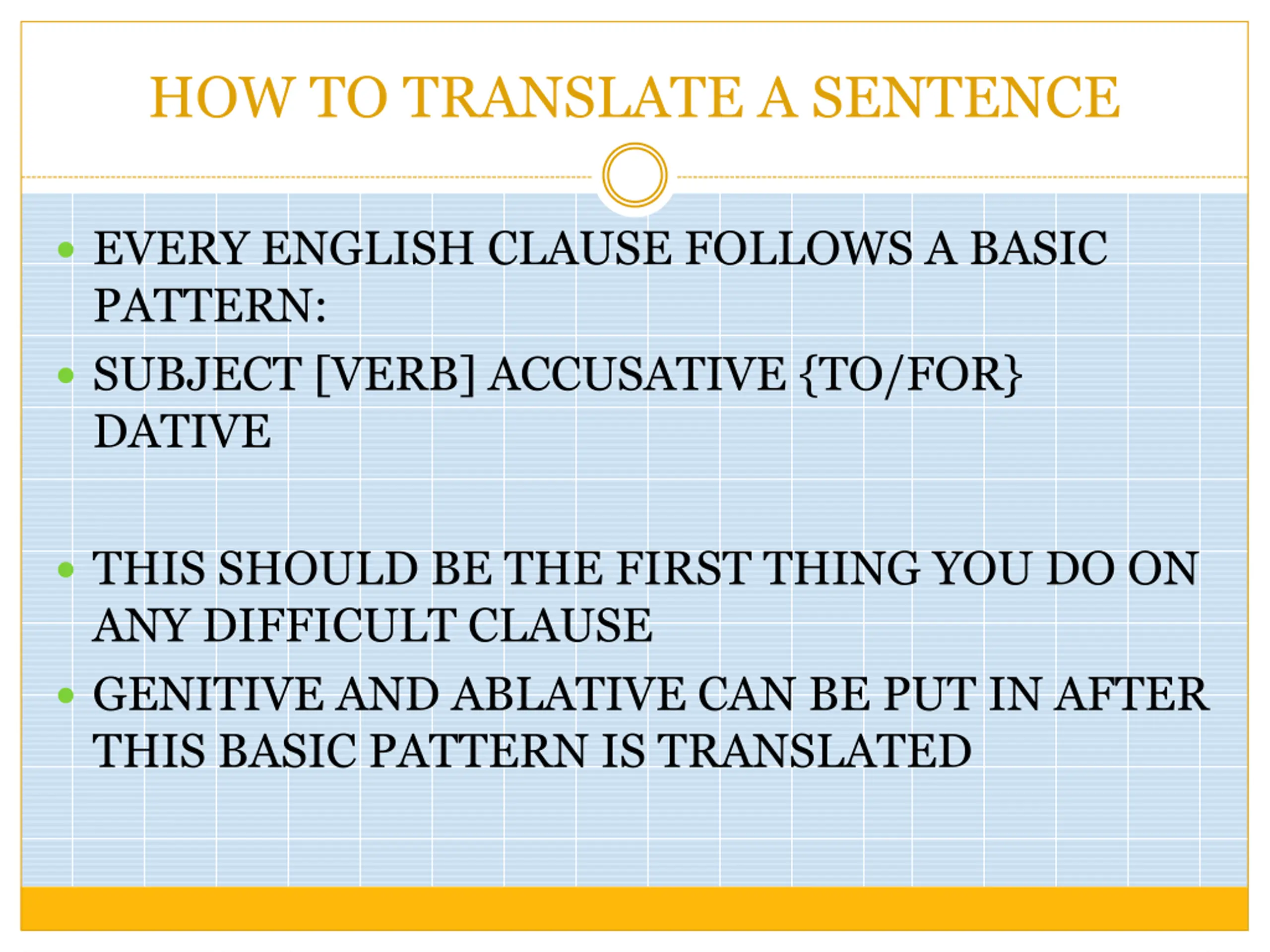 HOW TO TRANSLATE A SENTENCE EVERY ENGLISH CLAUSE FOLLOWS A BASIC PATTERN: SUBJECT [VERB] ACCUSATIVE {TO/FOR} DATIVE THIS SHOULD BE THE FIRST THING YOU DO ON ANY DIFFICULT CLAUSE GENITIVE AND ABLATIVE CAN BE PUT IN AFTER THIS BASIC PATTERN IS TRANSLATED