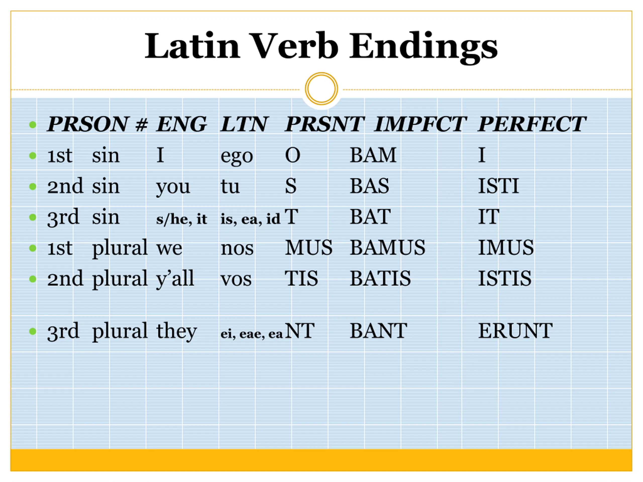 Latin Verb Endings PRSON # ENG LTN PRSNT IMPFCT PERFECT 1st sin I ego O 2nd sin you tu S 3rd sin s/he, it 1st plural we nos MUS BAMUS 2nd plural y all vos TIS BAM BAS BAT I ISTI IT IMUS ISTIS is, ea, idT BATIS 3rd plural they ei, eae, eaNT BANT ERUNT