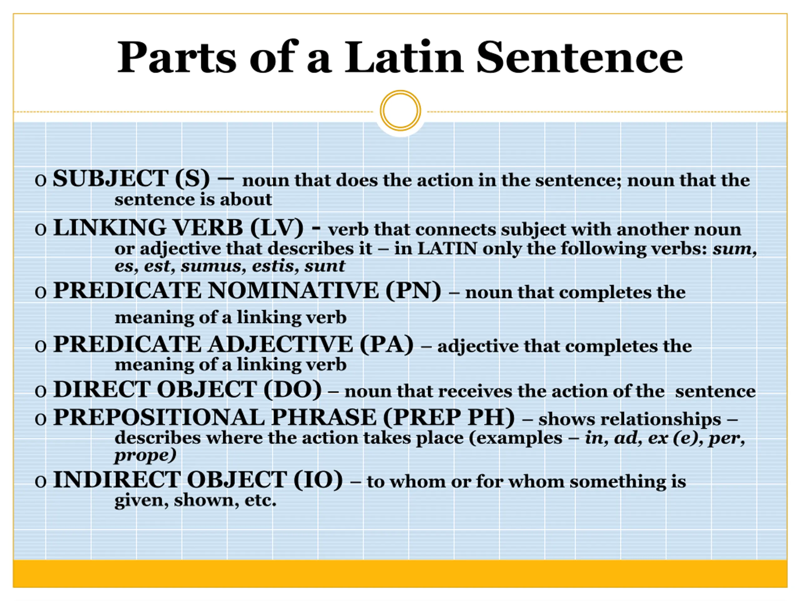 Parts of a Latin Sentence o SUBJECT (S) noun that does the action in the sentence; noun that the sentence is about o LINKING VERB (LV) - verb that connects subject with another noun or adjective that describes it in LATIN only the following verbs: sum, es, est, sumus, estis, sunt o PREDICATE NOMINATIVE (PN) noun that completes the meaning of a linking verb o PREDICATE ADJECTIVE (PA) adjective that completes the meaning of a linking verb o DIRECT OBJECT (DO) noun that receives the action of the sentence o PREPOSITIONAL PHRASE (PREP PH) shows relationships describes where the action takes place (examples in, ad, ex (e), per, prope) o INDIRECT OBJECT (IO) to whom or for whom something is given, shown, etc.