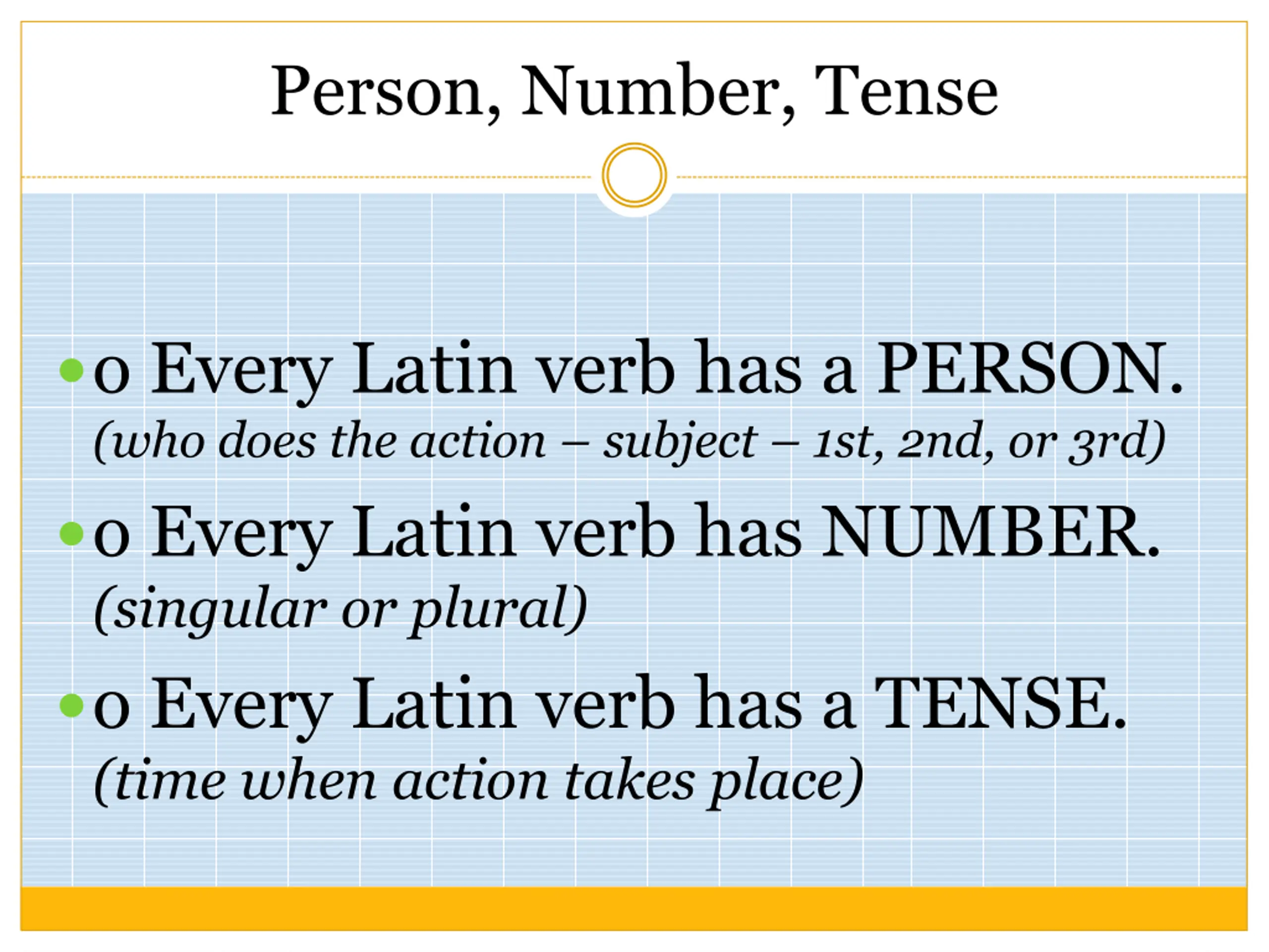 Person, Number, Tense o Every Latin verb has a PERSON. (who does the action subject 1st, 2nd, or 3rd) o Every Latin verb has NUMBER. (singular or plural) o Every Latin verb has a TENSE. (time when action takes place)