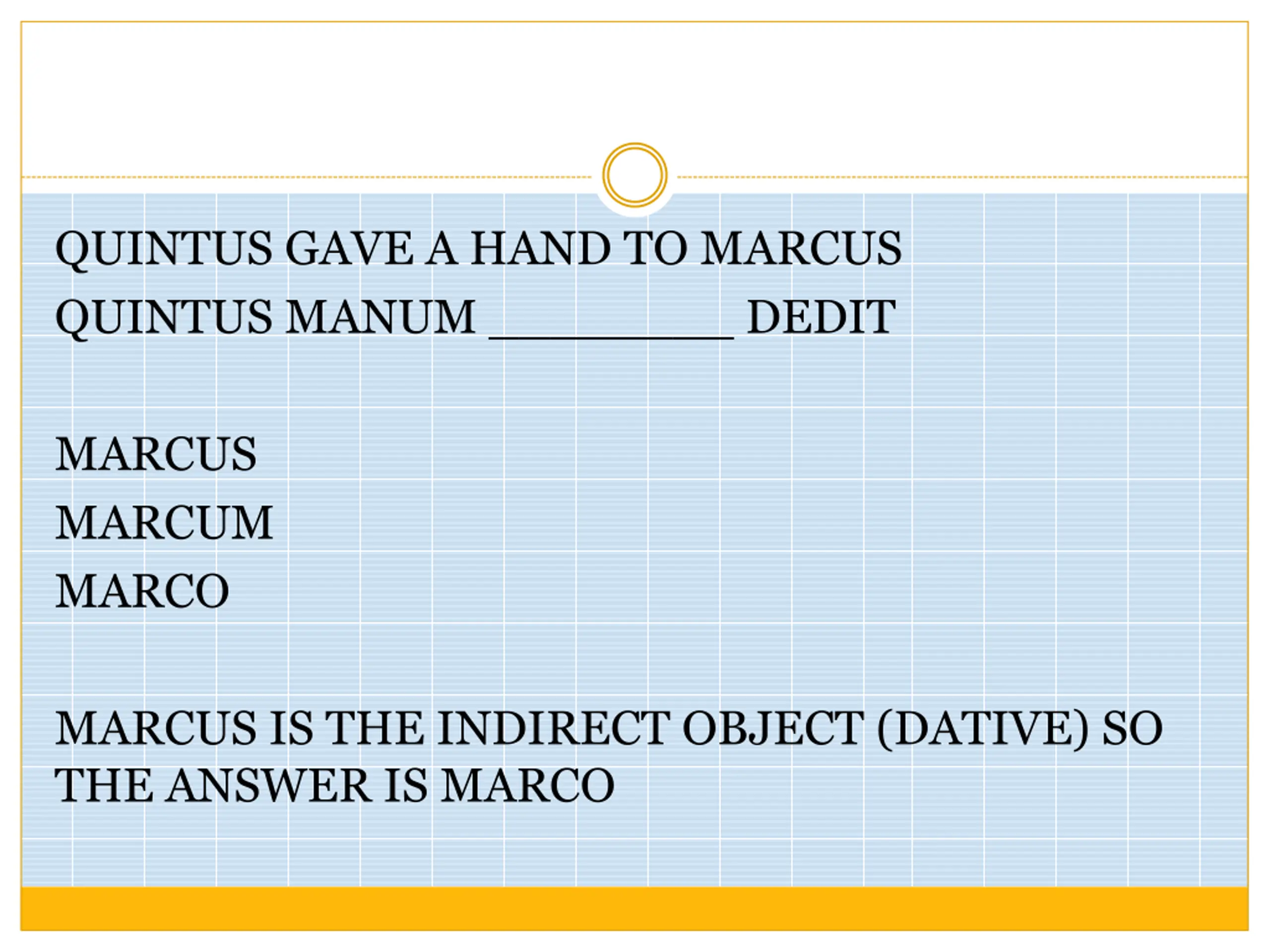 QUINTUS GAVE A HAND TO MARCUS QUINTUS MANUM ________ DEDIT MARCUS MARCUM MARCO MARCUS IS THE INDIRECT OBJECT (DATIVE) SO THE ANSWER IS MARCO